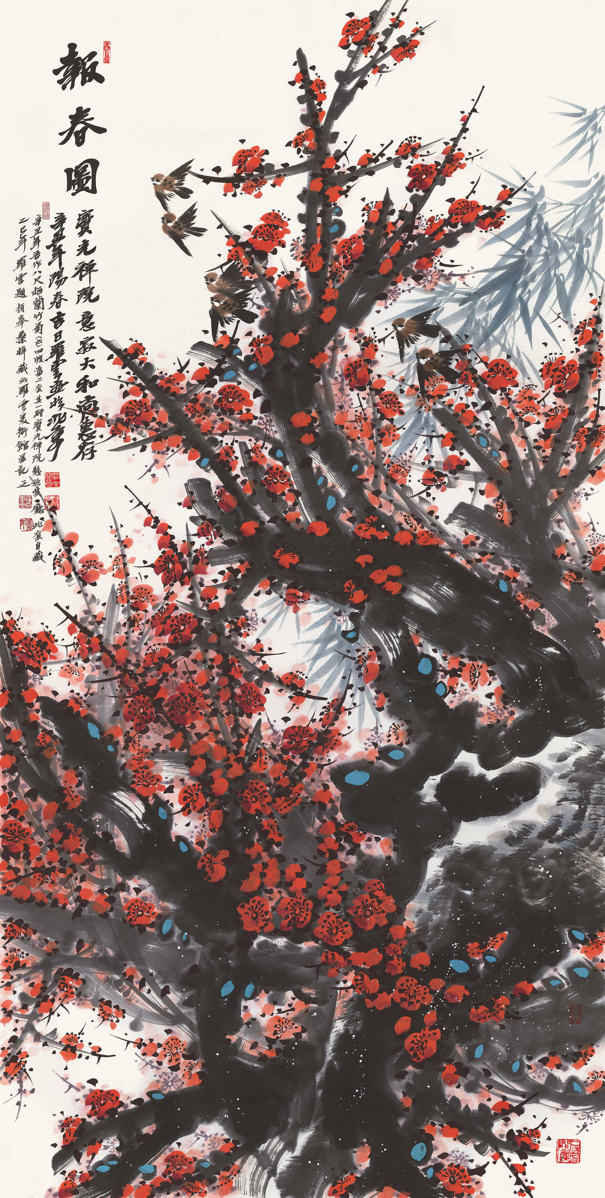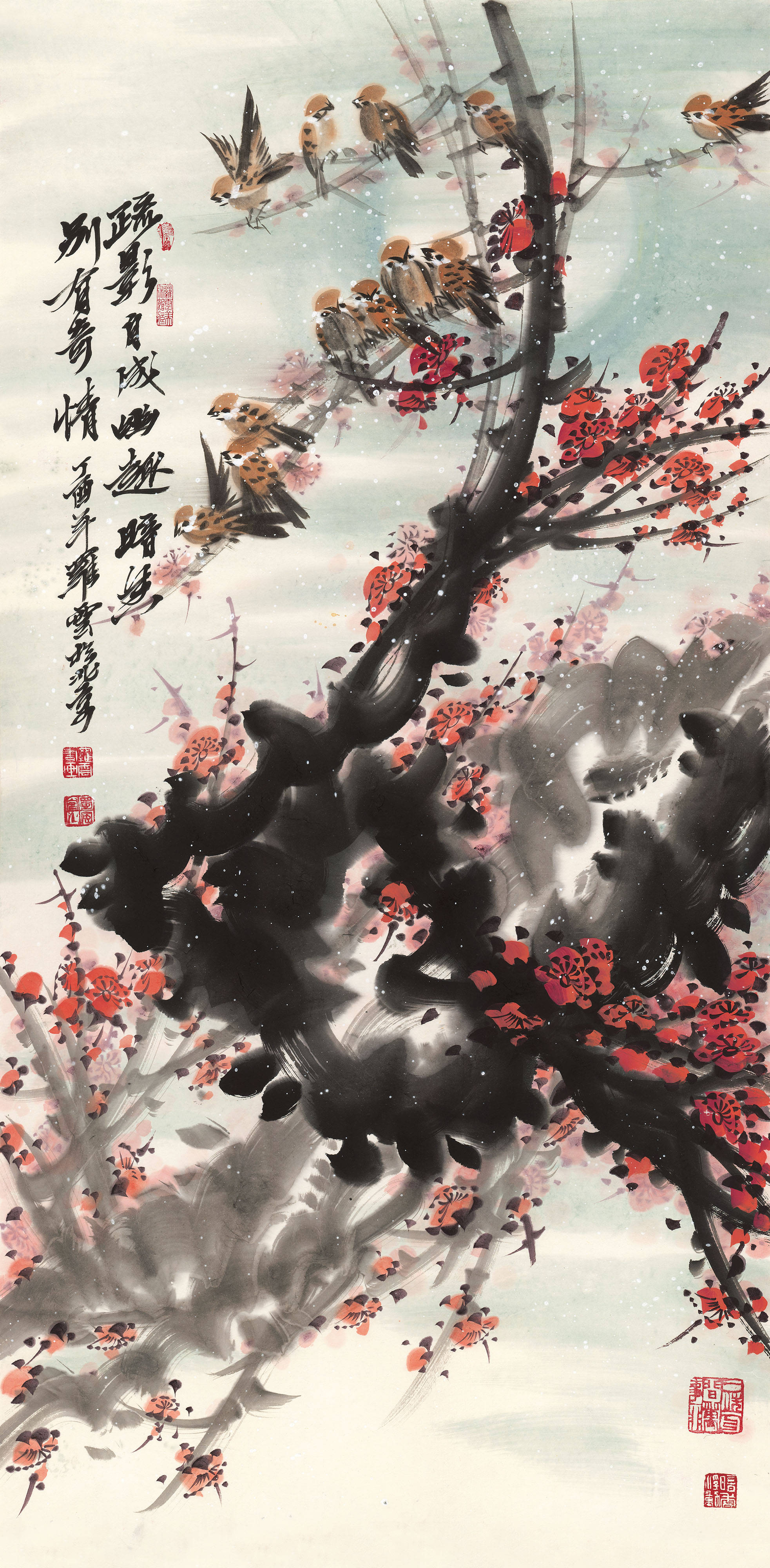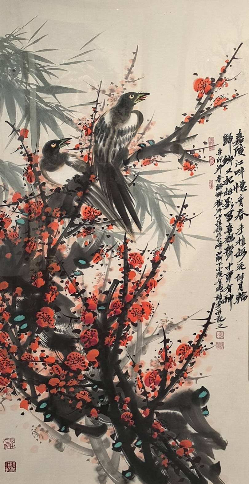 其花鸟世界,则另辟一方澄明之境。毛驴画系列最负盛名:或三五成群,漫步秋林;或独自俯首,静嚼岁月。先生画驴,不重其形,而贵得其神——那温顺中的倔强,平凡里的坚韧,恰是民族性格的生动写照。至若梅兰竹菊“四君子”题材,更是推陈出新:红梅如火,燃烧冰崖;幽兰吐馥,香满空谷;修竹凌云,风骨铮铮;秋菊傲霜,金甲凛然。先生以书入画,线条如篆籀沉雄;用墨五彩,浓淡皆成雅然意趣。