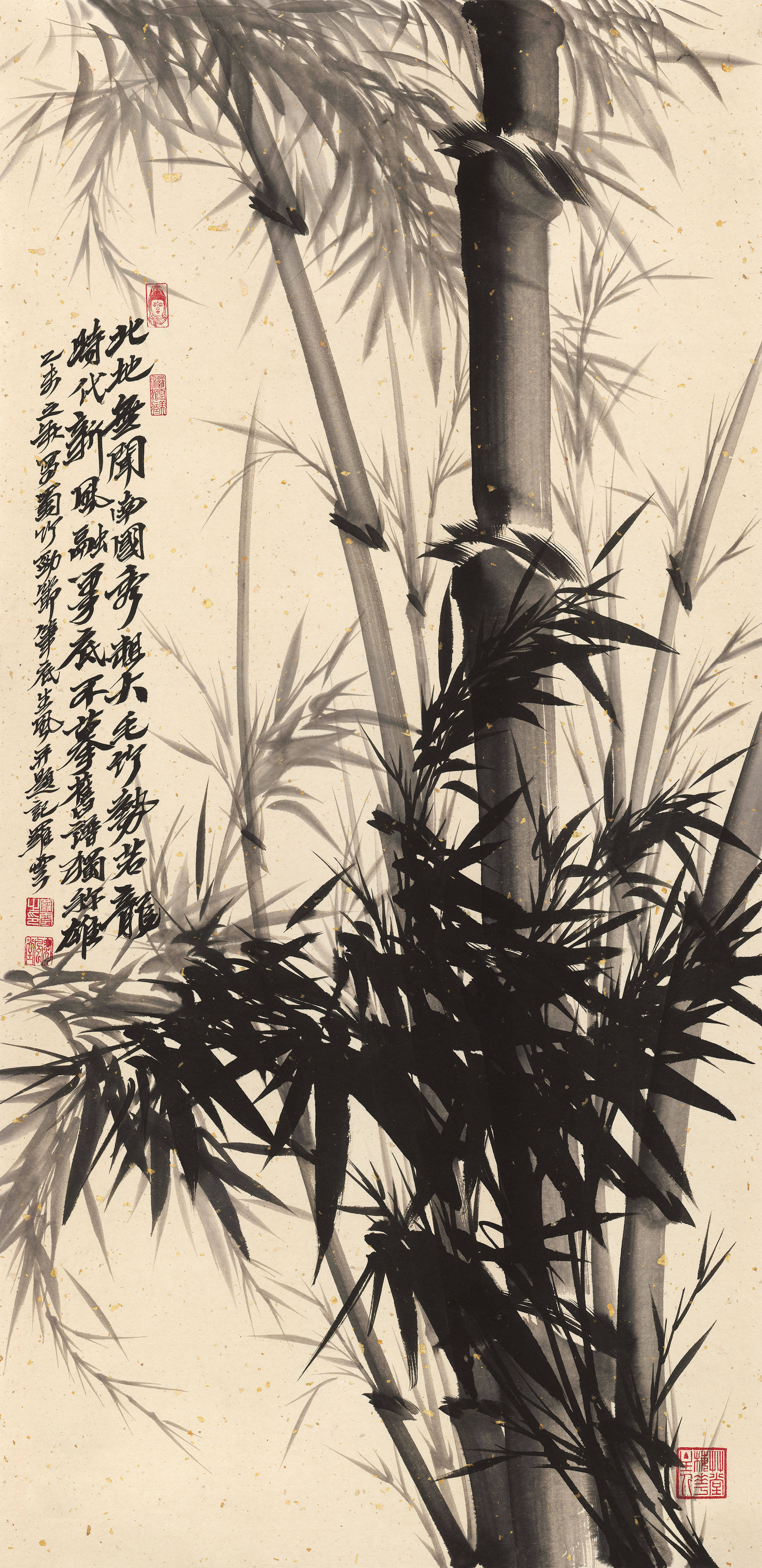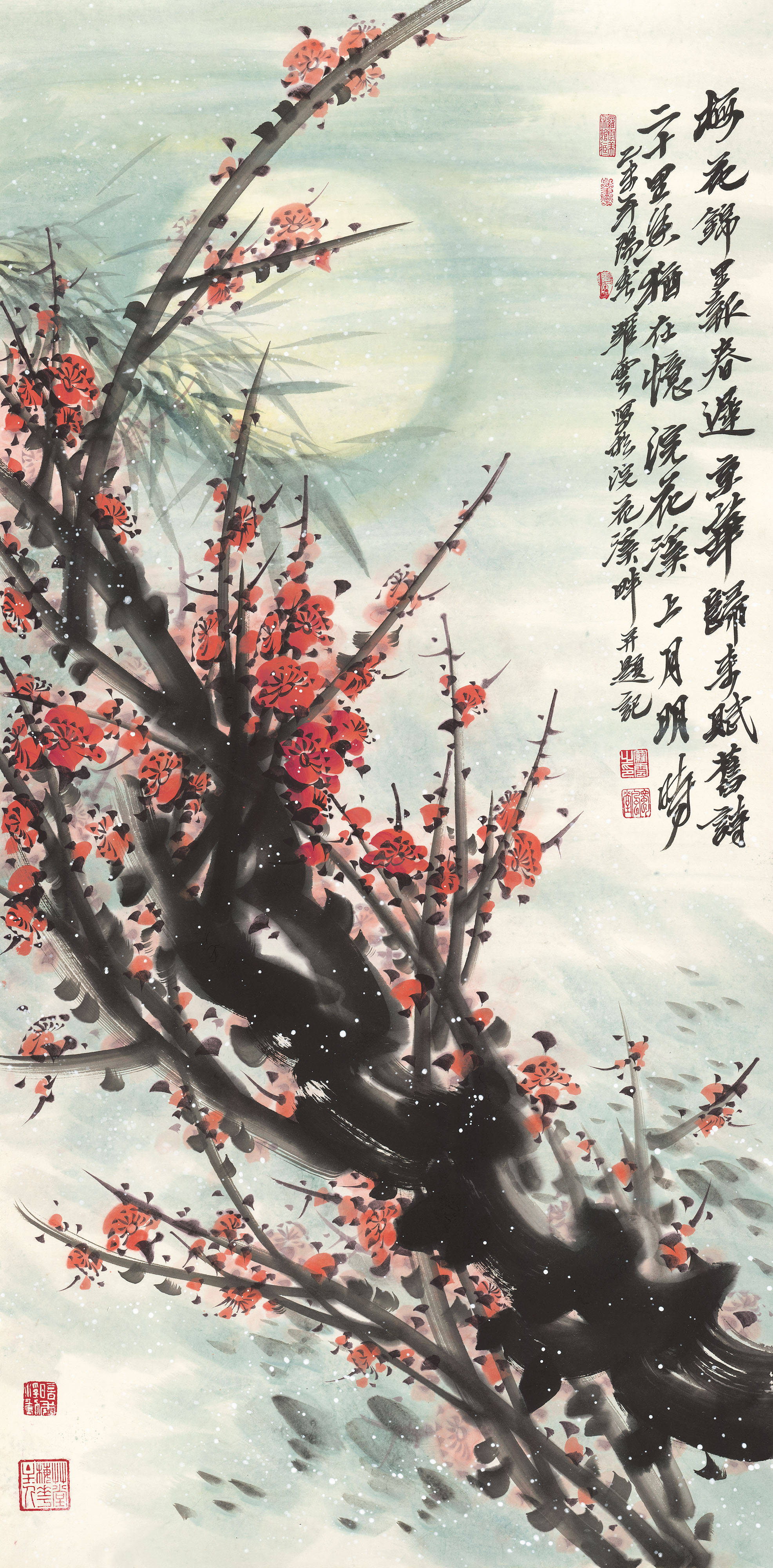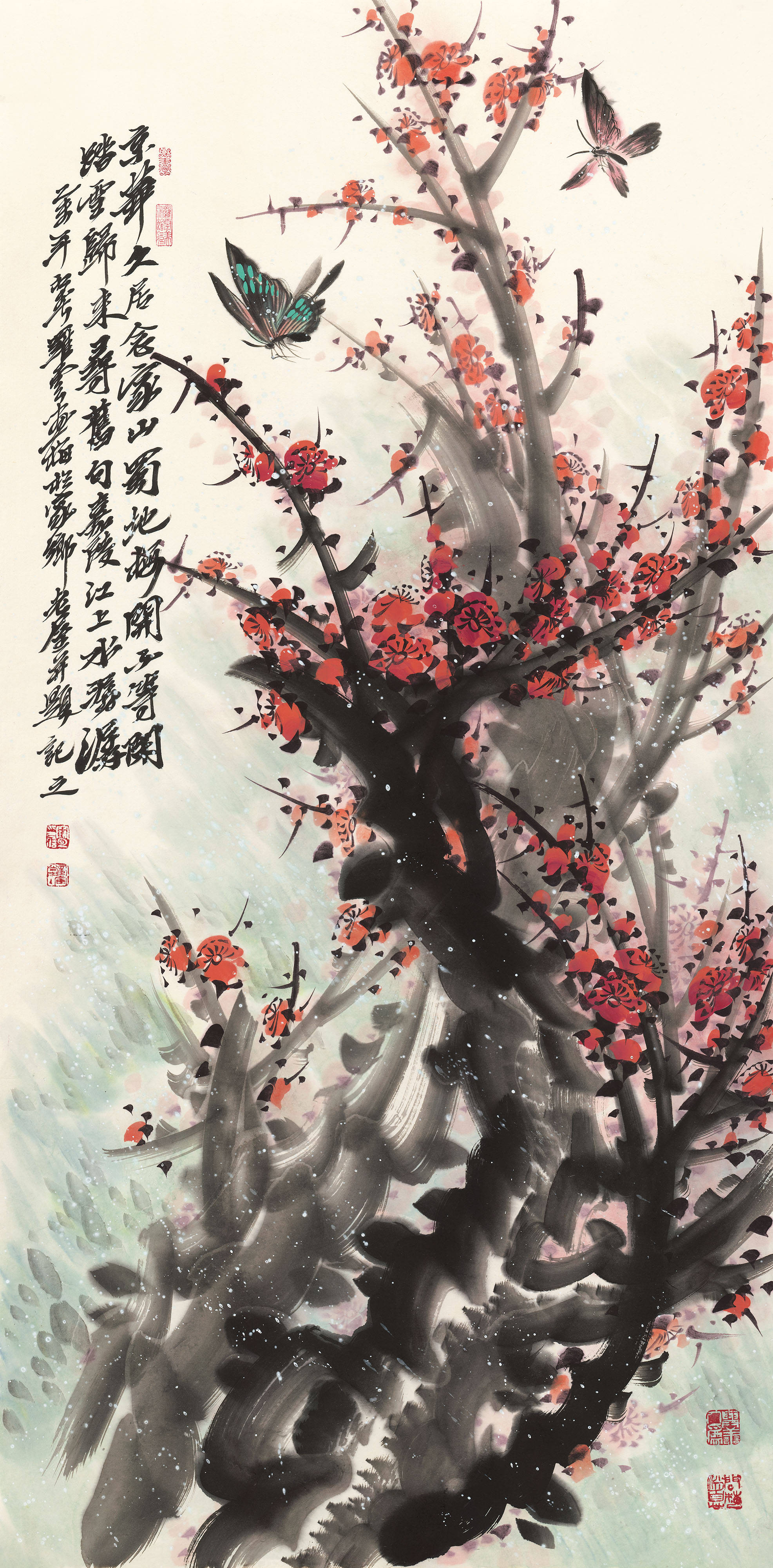 其花鸟世界,则另辟一方澄明之境。毛驴画系列最负盛名:或三五成群,漫步秋林;或独自俯首,静嚼岁月。先生画驴,不重其形,而贵得其神——那温顺中的倔强,平凡里的坚韧,恰是民族性格的生动写照。至若梅兰竹菊“四君子”题材,更是推陈出新:红梅如火,燃烧冰崖;幽兰吐馥,香满空谷;修竹凌云,风骨铮铮;秋菊傲霜,金甲凛然。先生以书入画,线条如篆籀沉雄;用墨五彩,浓淡皆成雅然意趣。