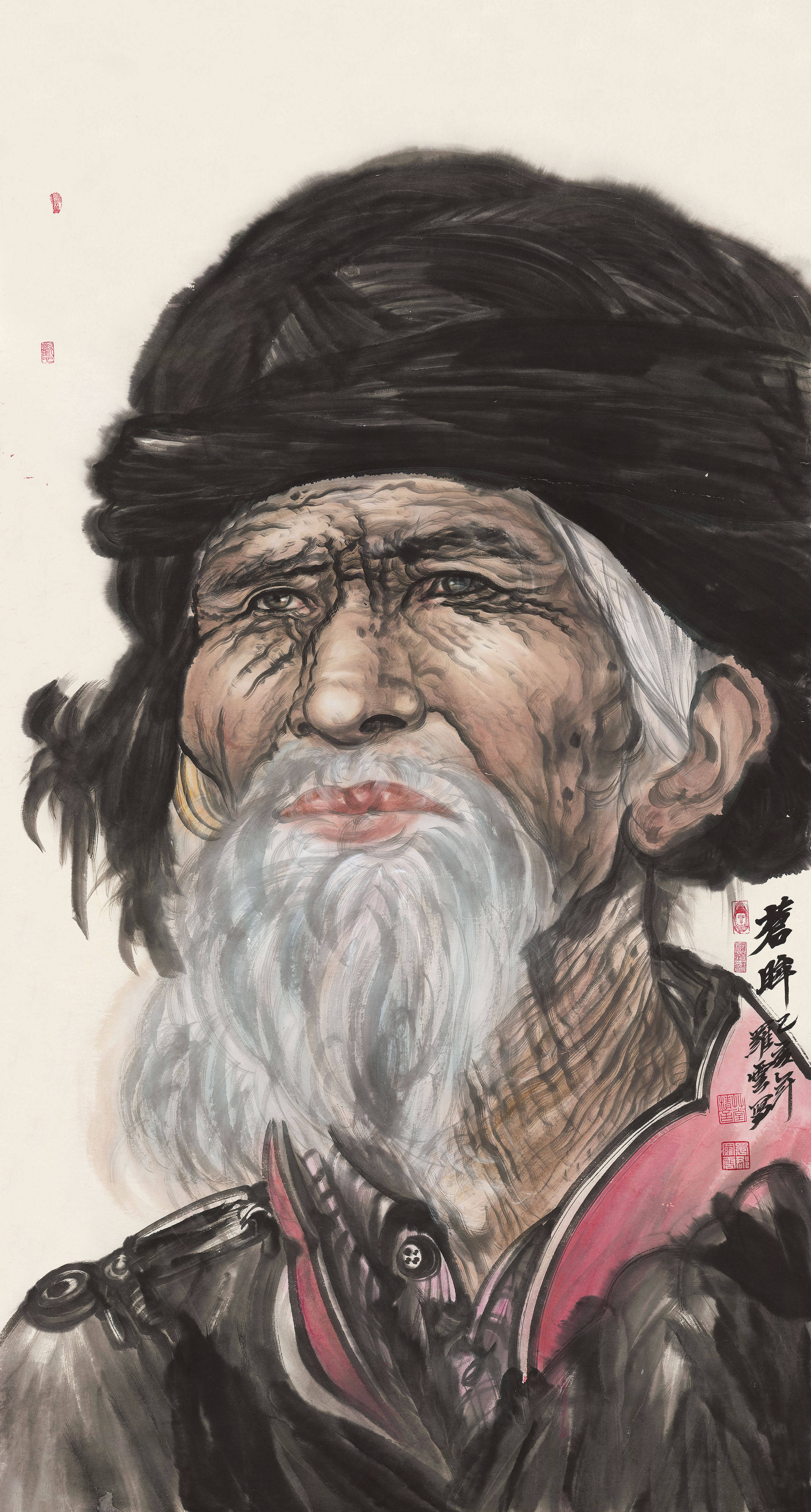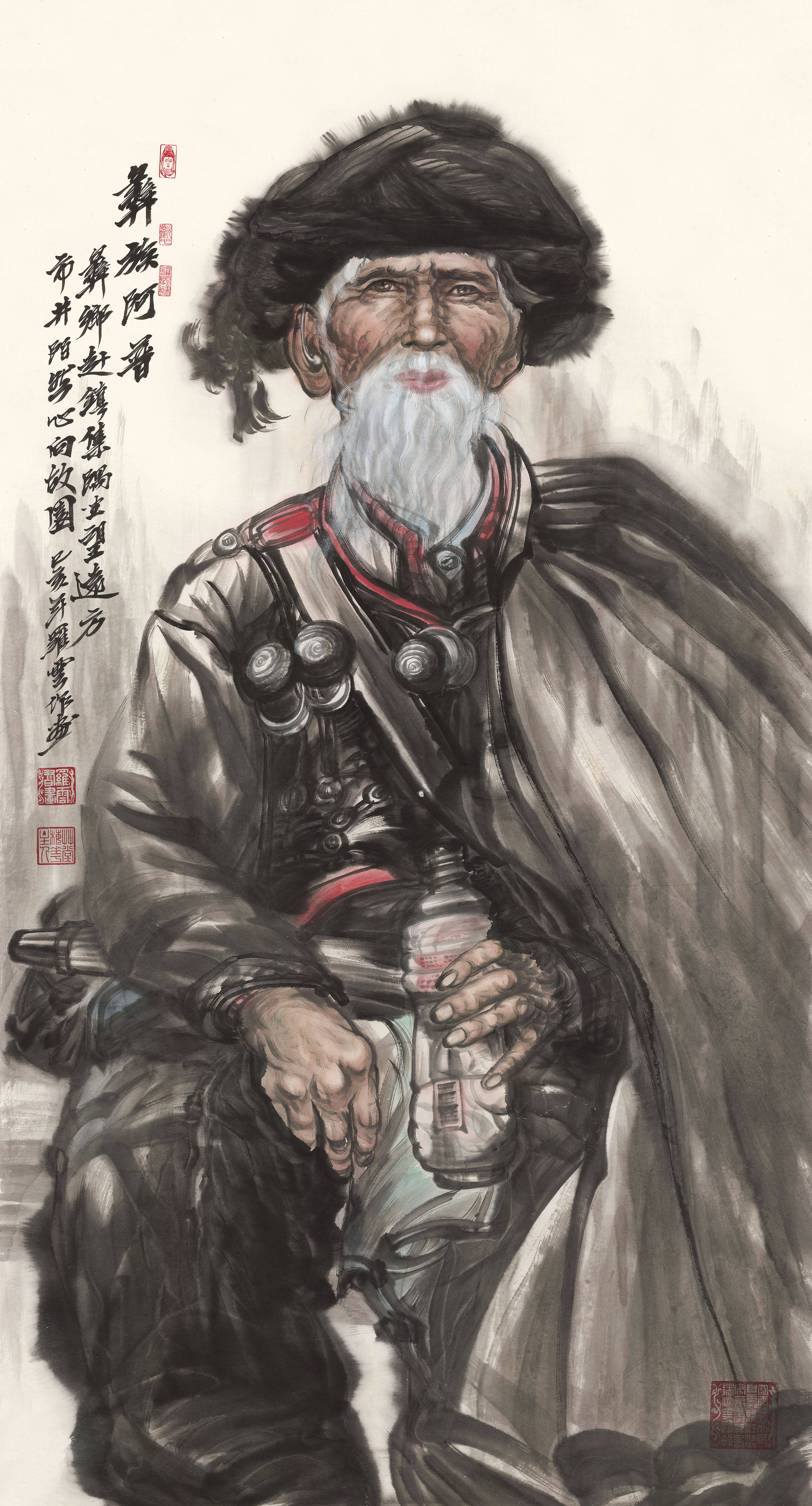其人物画,以《从悲壮走向豪迈》为巍峨丰碑。此作由李杰撰文《放歌伟大的时代和英雄的人民》,发表于《人民日报》《光明日报》《文汇报》等,获全国纪念汶川抗震救灾三周年美术作品金奖,绝非偶然也。画面中,灾后重建的羌寨巍然屹立,各族儿女携手并肩,眉宇间悲怆已化为坚韧,废墟上希望正如春草蔓生。先生以雷霆之笔勾勒山石筋骨,以春雨之墨渲染人间温情,创造出“铁骨柔情”的独特语境。其他如《齐白石》《幸福时光》《彝族老阿妈》《苍眸》等作,皆以形写神,捕捉当代中国精神气象,笔下的劳动者、建设者、守望者,无不闪耀着生命的尊严与人性的光辉。徐悲鸿夫人廖静文先生对罗云大写意人物画高度评价:狂写千古风流,醉眼人世沧桑。