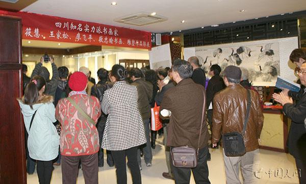 2 0 1 5”畅想中国梦丹青绘宏图”新年书画雕塑五人联展,今天下午14.30分在四川省文化馆开幕。在中国农工民主党四川省委文化艺术委员会,中国农工民主党成都市委员会四川省文化馆,四川省美术家协会,成都市共术冢协会的主办、指导下,在四川省文化馆馆藏文物管理与展览中心,四川樨林书画院,四川省农工画院,成都益州书画院,四川古色今香艺术品博览馆的承办和大力支持下,并由知名画家筱慧女士的倡议和牵头组织下,经过长达半年时间的精心筹备,终于与大家见面展出了。五位知名书画雕塑家叶长生、筱慧、王家松、敬忠瑜、廖飞平的作品分别有人物、山水、花鸟、书法、雕塑等,展出主要以弘扬中华传统文化、传播文艺正能量、繁荣四川书画艺术市场、推动文化产业大发展为宗旨、契机,认真学习落实习近平总书记在北京文艺座谈会上的重要讲话精神,为贯彻党的文艺路线和方针,以“畅想中国梦 丹青绘宏图”为主题开展五人书画雕塑作品联展交流活动。委中华民族复兴,实现伟大“中国梦·我的梦”而努力。