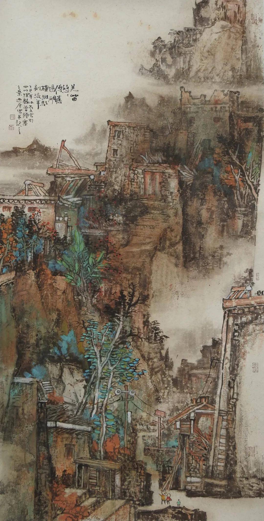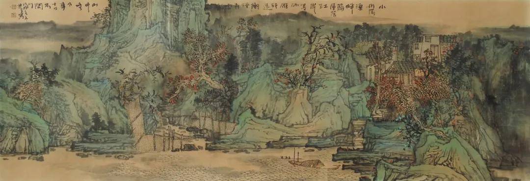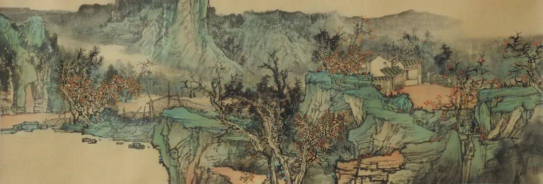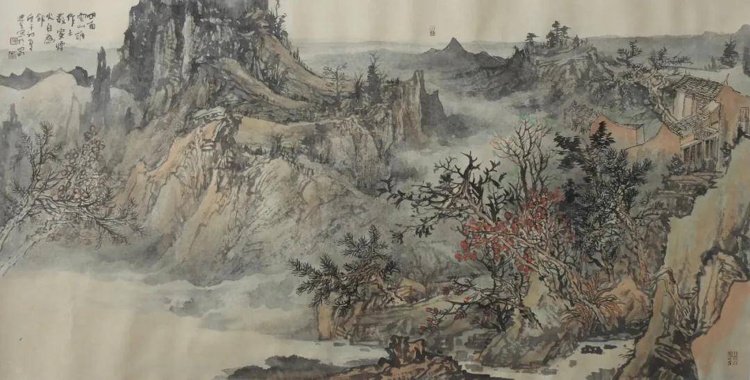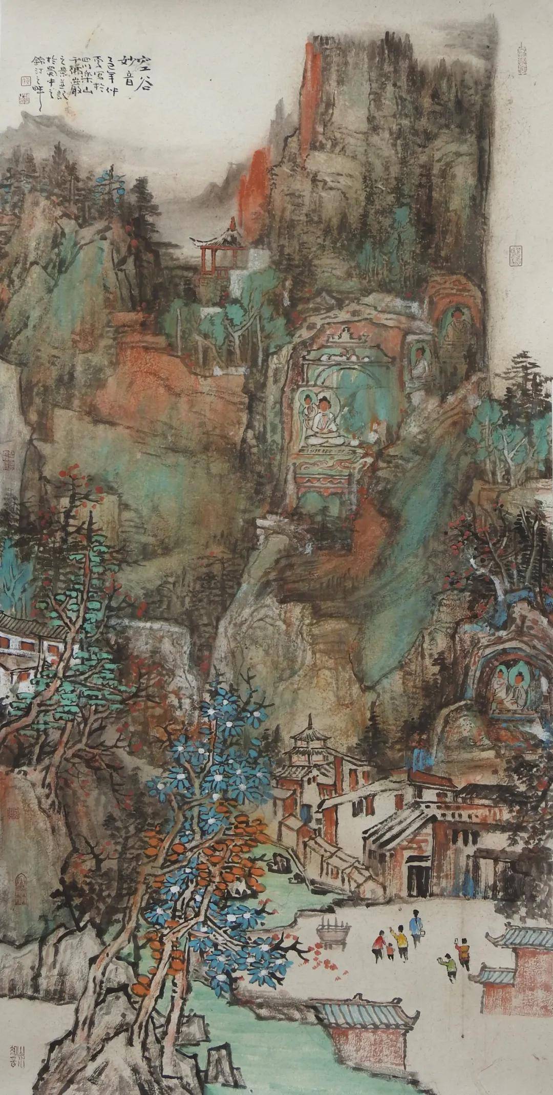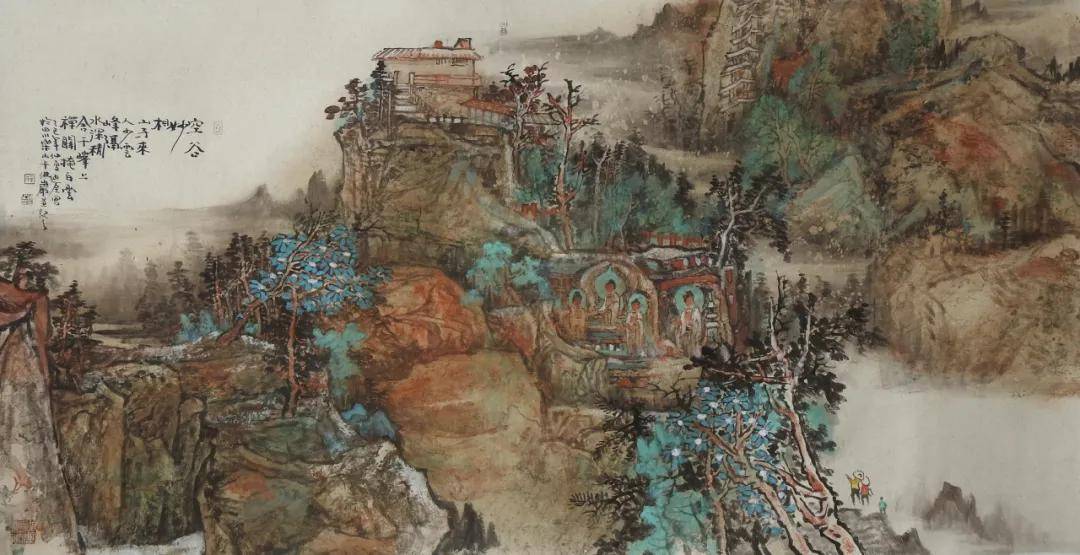 在黄迪全的画面中,构图上既有宋代巨嶂山水式的雄浑磅礴,细节上也融入了对石窟,林木,屋宇巧尽精微的描绘,虽无"逸笔草草",但在恢弘格局和皴擦点染间,营造出佛国的幽远意境,实现了"写意"与"尚工"的融合。此外,他的笔墨单纯,颜色大多为浅绛,石青,石绿等,令人联想到敦煌传统色,如《撰集百缘经》中提到五色:"出五色光,遍照世界,作种种色。"五色通过浓墨,焦墨,淡墨等交替运用产生了丰富的变化,其中晕染的抽象色块也为画面注入了现代主义的气息,形成了文明交汇,胜迹沧桑的色彩痕迹。黄迪全的山水画实现了古与今的对话,传递着山水清音的回响。