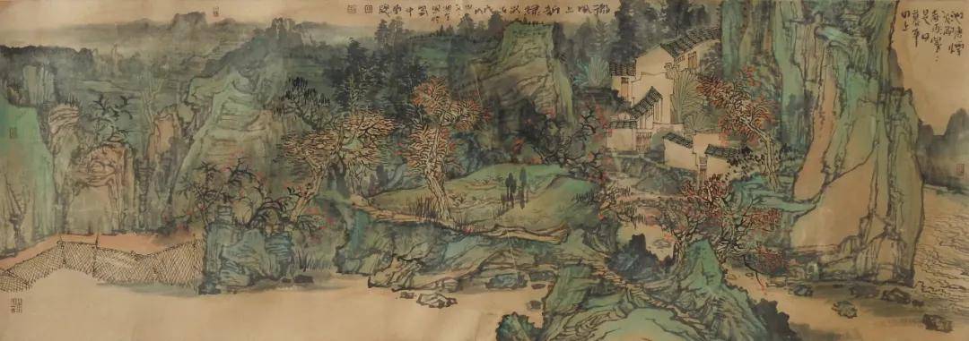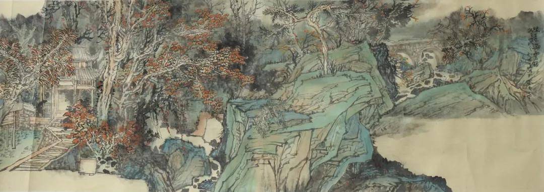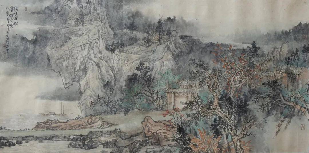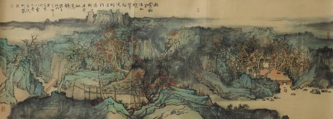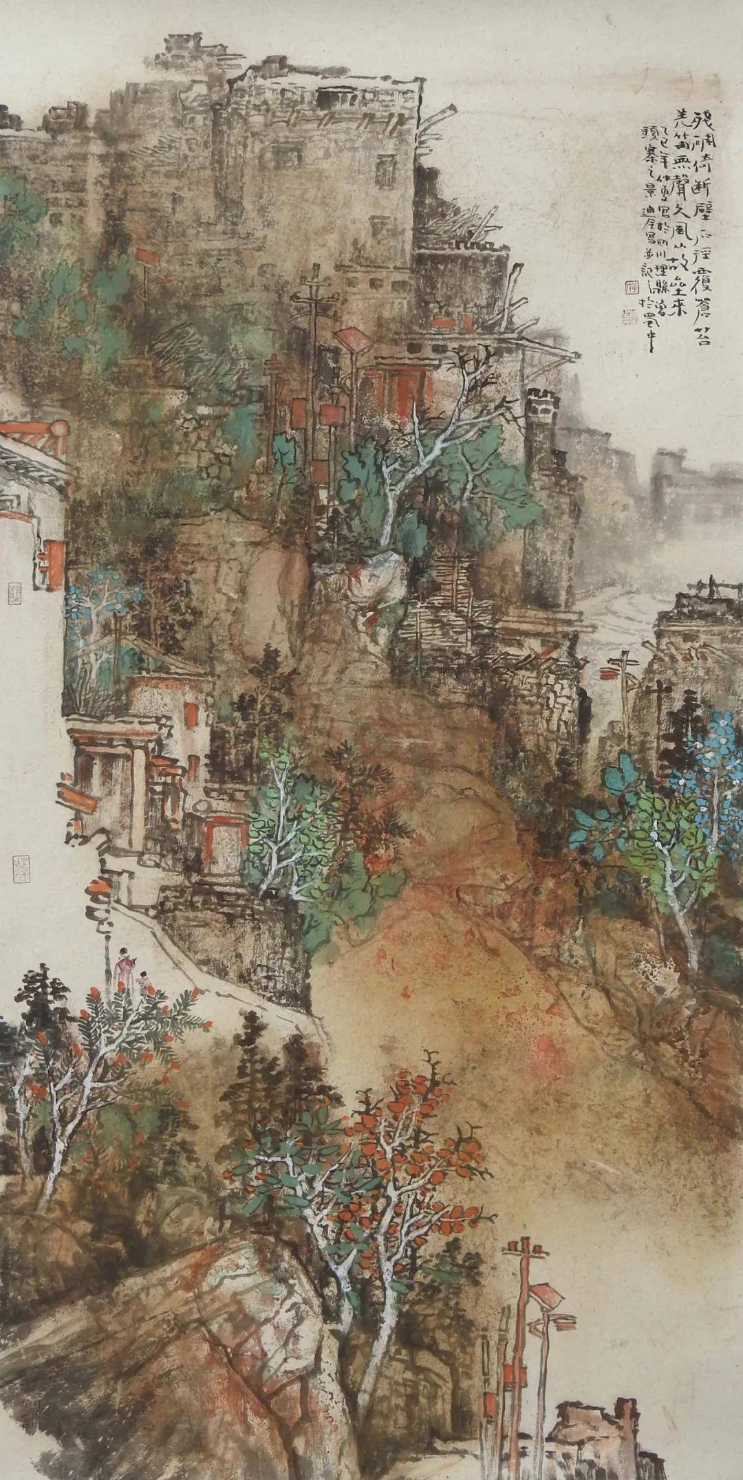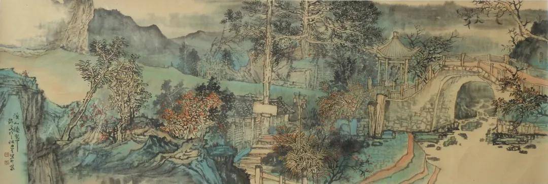 在黄迪全的画面中,构图上既有宋代巨嶂山水式的雄浑磅礴,细节上也融入了对石窟,林木,屋宇巧尽精微的描绘,虽无"逸笔草草",但在恢弘格局和皴擦点染间,营造出佛国的幽远意境,实现了"写意"与"尚工"的融合。此外,他的笔墨单纯,颜色大多为浅绛,石青,石绿等,令人联想到敦煌传统色,如《撰集百缘经》中提到五色:"出五色光,遍照世界,作种种色。"五色通过浓墨,焦墨,淡墨等交替运用产生了丰富的变化,其中晕染的抽象色块也为画面注入了现代主义的气息,形成了文明交汇,胜迹沧桑的色彩痕迹。黄迪全的山水画实现了古与今的对话,传递着山水清音的回响。
