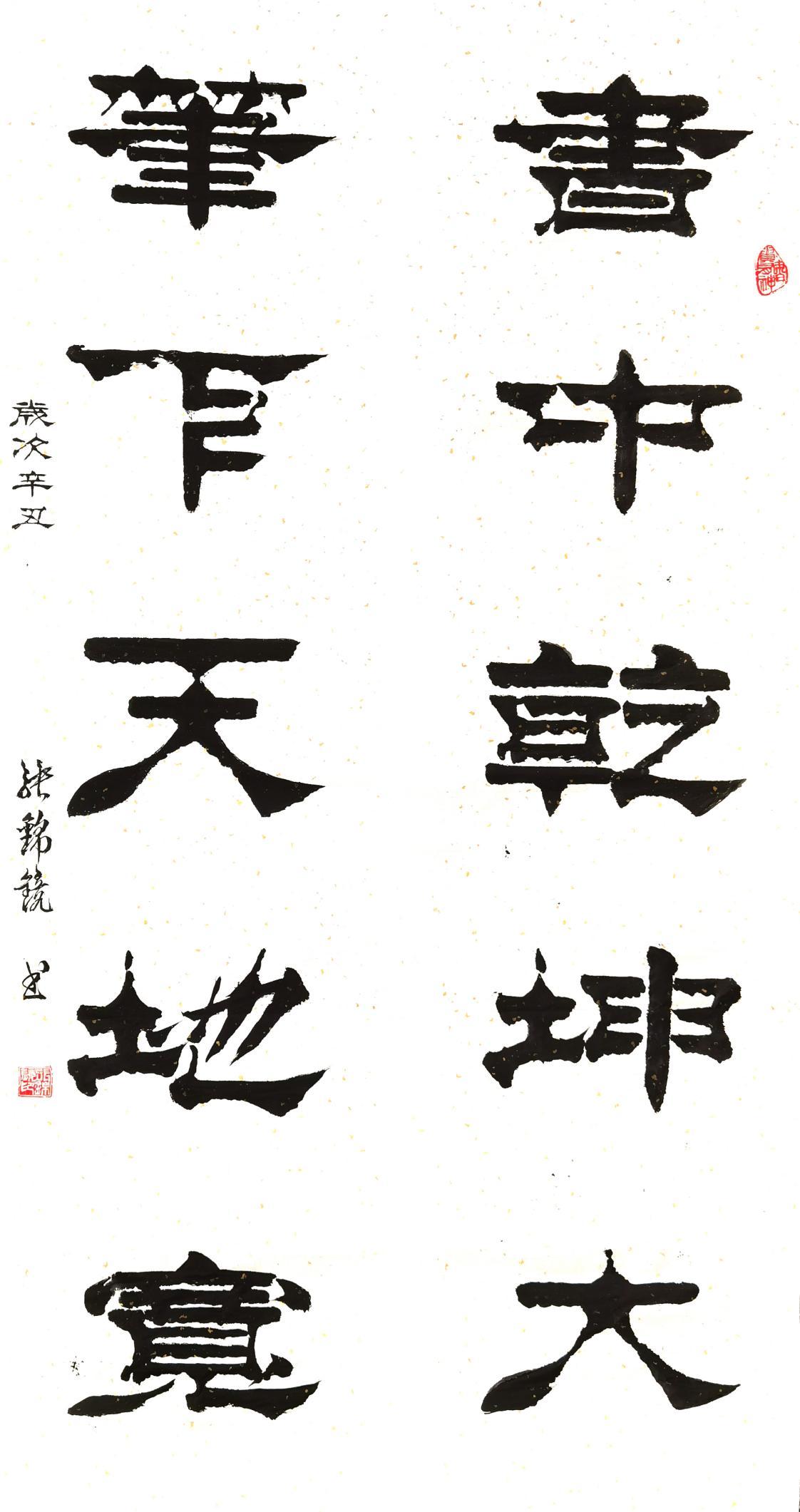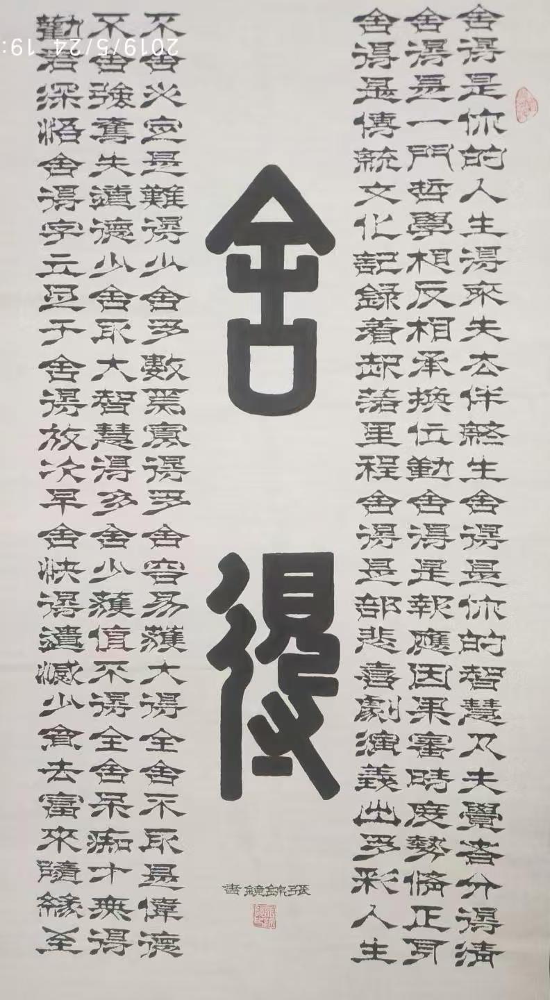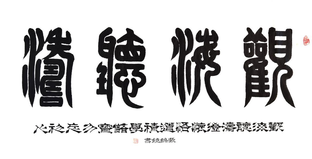 张锦镜作品突出,更源于他对每书一幅作品都会深入解读其来源,并融合自己对其的理解,进而促成成品的实现。例如他汇集历代名家书写的“百寿”自己用小篆书写了《福缘千寿图》。对世传的《舍得》二字进行了深层次地思想内含的理解挖掘,书写出了《舍得》诗,更悟出人生哲理。把传统的《福禄寿禧》的《各100字》创新书写各为101个字的《福禄寿禧健》,强化新时代“健康第一”的人生,开启了创造了101个“健”字书写的先河,并赋予了百尺竿头,更进一步,不断前行新的寓意。得到国家版权局的认证,为华夏民族的“文化园”增添了别样的花束。