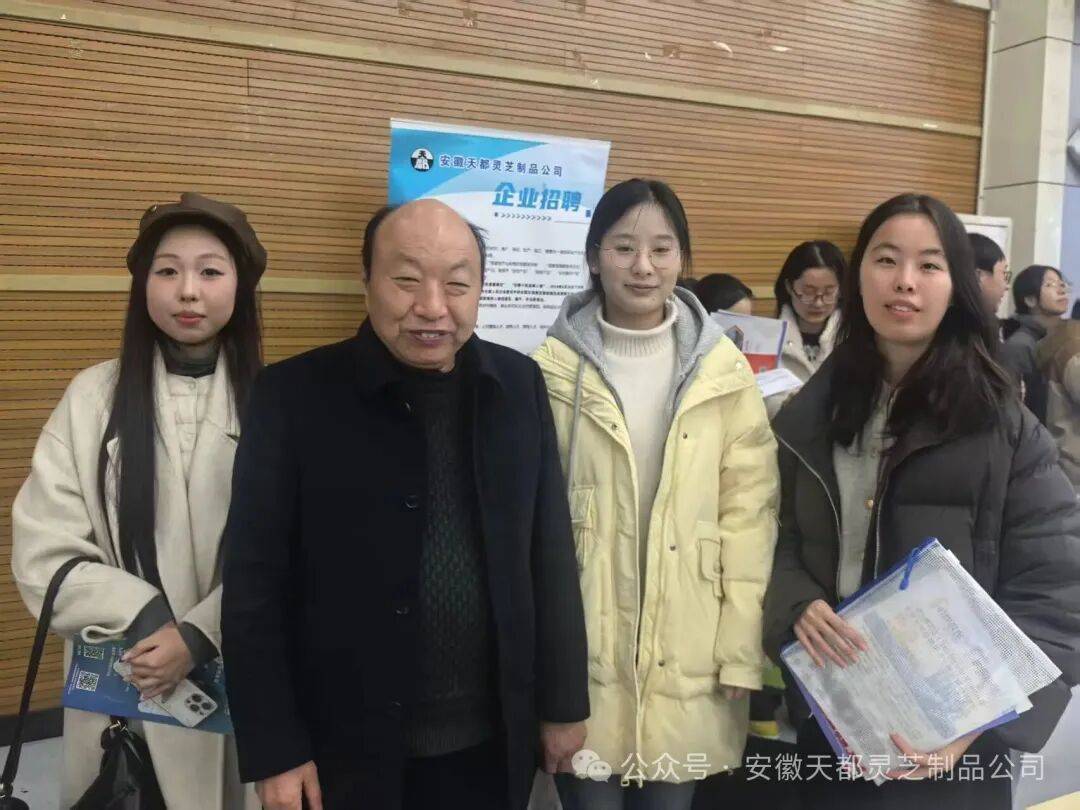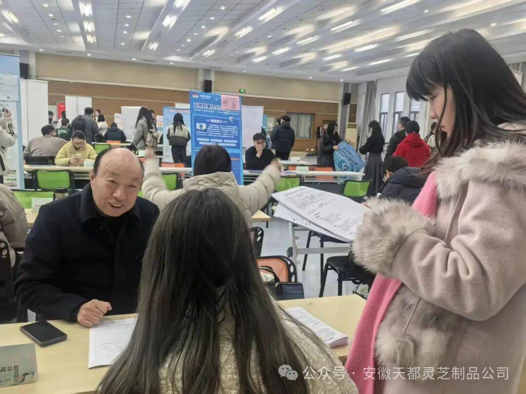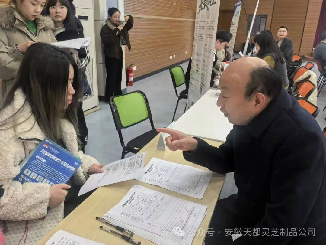 丁伦保坐在招聘台,亲切和投简历的同学们交流、攀谈,问他们学什么专业,应聘哪个岗位,有何理想与追求,还细心地看了他们的简历。他向同学们介绍天都公司的产品及未来发展方向,以及人才引进的具体条件和标准。丁伦保说,安徽天都灵芝制品公司的食用菌技术与产品面向全国、走向国际,急需一批人才充实公司的领导管理层。欢迎同学们到天都公司走走看看,进一步了解食用菌产业的发展前景,期待与大家合作,共创食用菌产业的宏伟蓝图。