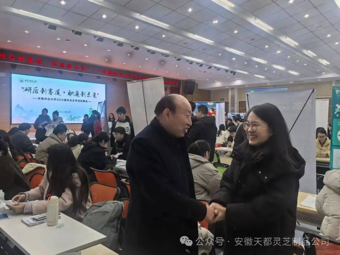 2025年12月23日安徽天都灵芝制品公司董事长、蘑菇大王丁伦保在安徽农业大学参加“研后新赛道、职通新未来”2026届毕业生专场招聘会。