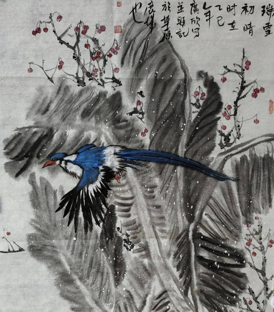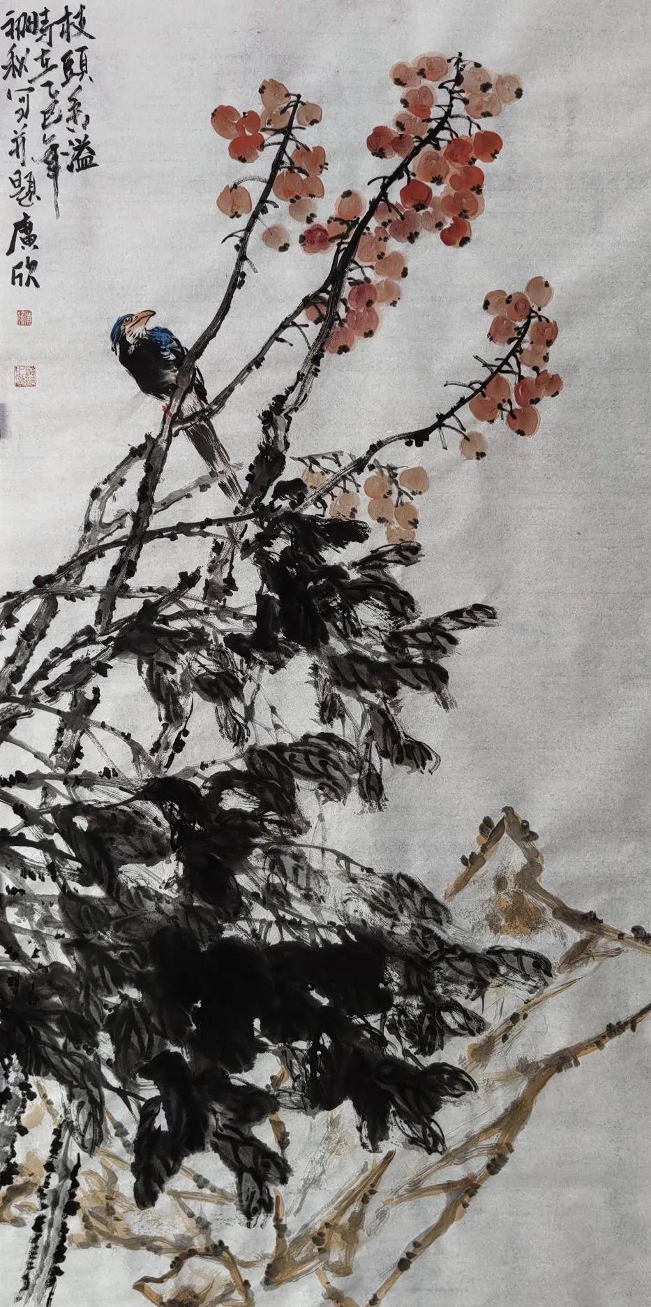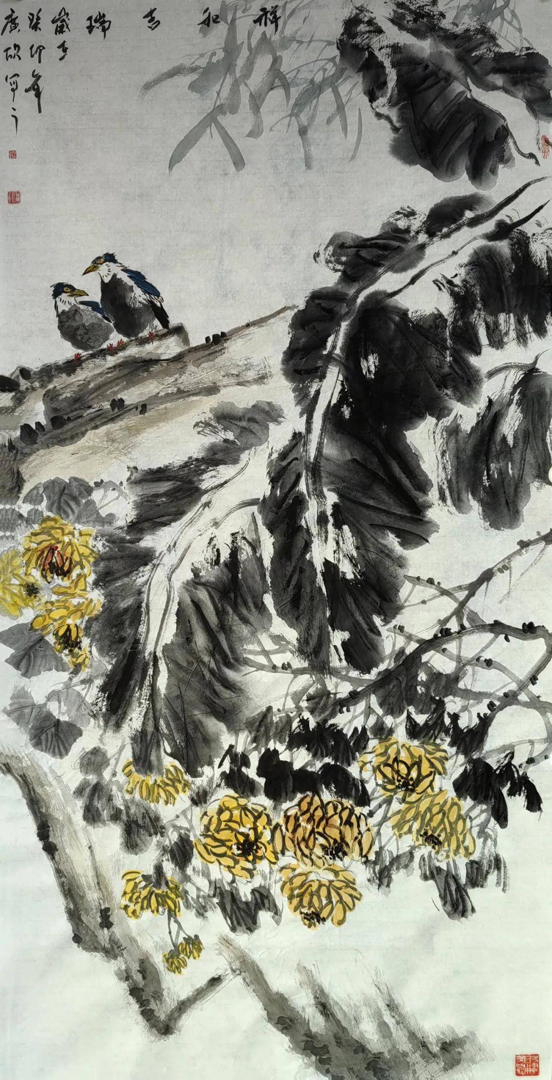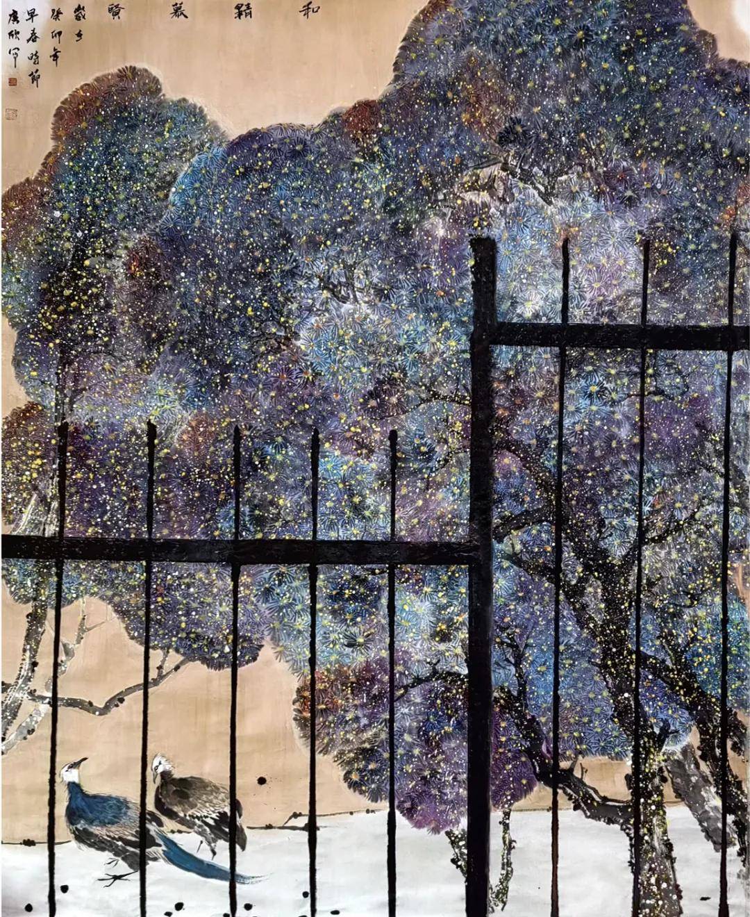 杜广欣先生的笔墨语言,是传统基因的创造性裂变。他深谙宋元花鸟的精微之道,却拒绝成为优雅程式的囚徒。观其作品,老梅枝干以篆籀笔法写出,墨色苍茫如历经劫火,金石般的质地仿佛能触手生温;而枝头寒蕊却以近乎抽象的彩点迸发,冷冽中裹挟着生命的热望。这种奇妙的张力,源自他对传统“破”与“立”的辩证:将山水皴法化入花鸟筋骨,使工笔的谨严与写意的放达在冲突中达成新的和谐。画面不再是物象的仆从,而升腾为承载生命意志的图腾。