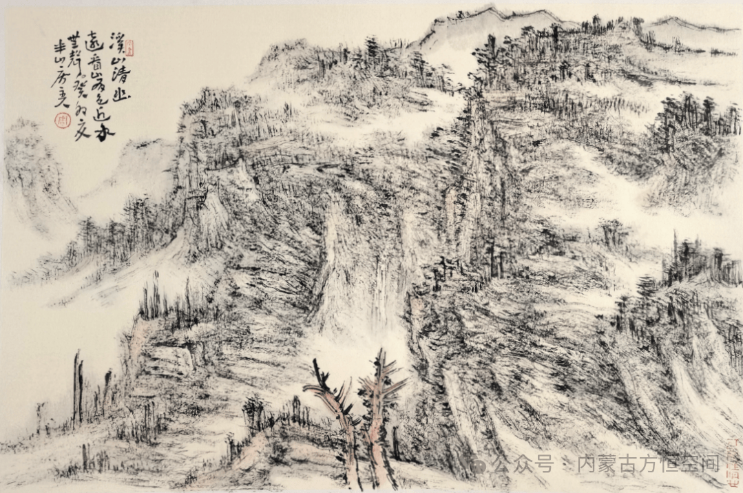 周鼎对山石的结构作以创新式的打造,在客观生活与主观意向结合的基础上进行了重组,形成了表现主题风格的新模式。一幅幅作品都如碑林耸立,彰显艺术高格的大势雄风。力透纸背的线条刻画出的山川铁骨铮铮,雄强的笔触构建出铁铸斧劈的质感。这一切全靠周鼎专业的笔下功夫和扎实的技法修养实现。全部的笔情墨意,都为创作意图服务,内敛到整体气势的恢宏之中,所有的技法都淡化了本身的存在,注入博大山川和灵秀之中。