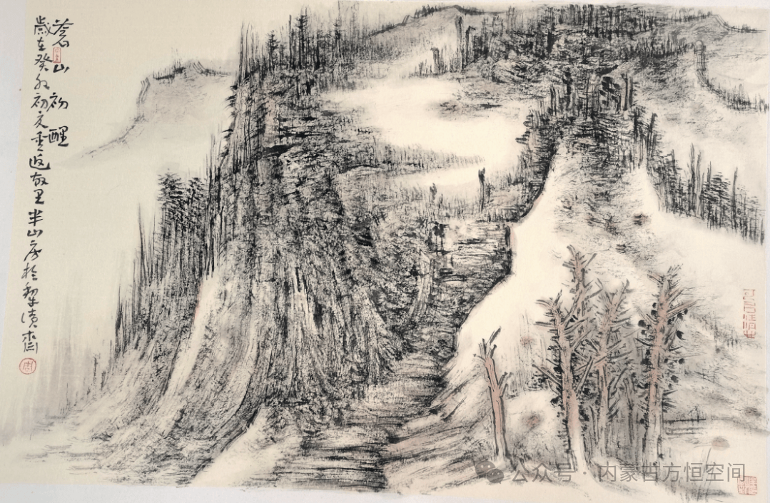 周鼎的系列画作,将树木的形象放大到极限。他将传统山水画中属于从属地位与点缀作用的树木,上升为画纸中的绝对主角,而隐约的山岗、广袤的原野却成了装点画面的配角。这样有意为之的处理,犹如将相机的镜头拉近到观者面前,更能切近地感受到画面中或茂密或疏朗树木旺盛的生命力,也更能充分感受到画者的笔墨意图与精神追求。