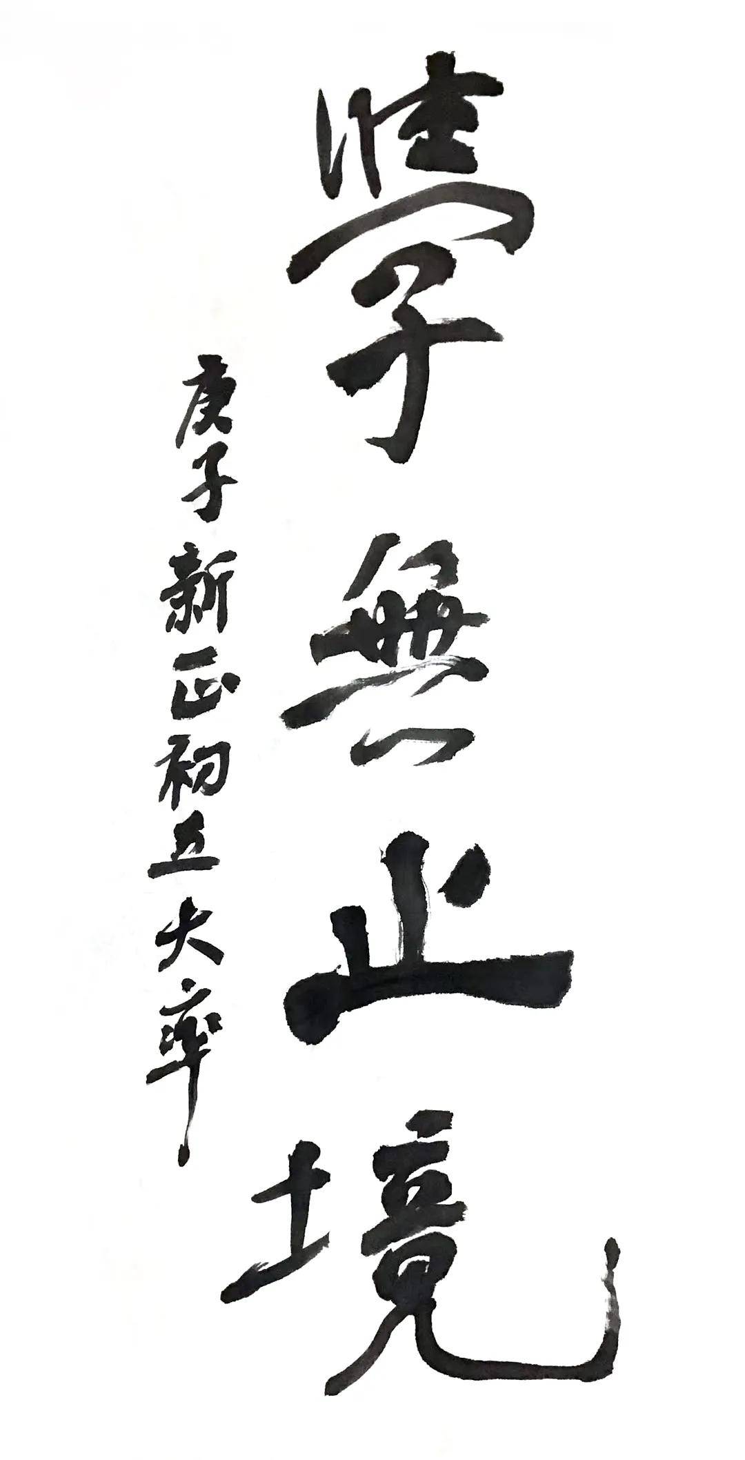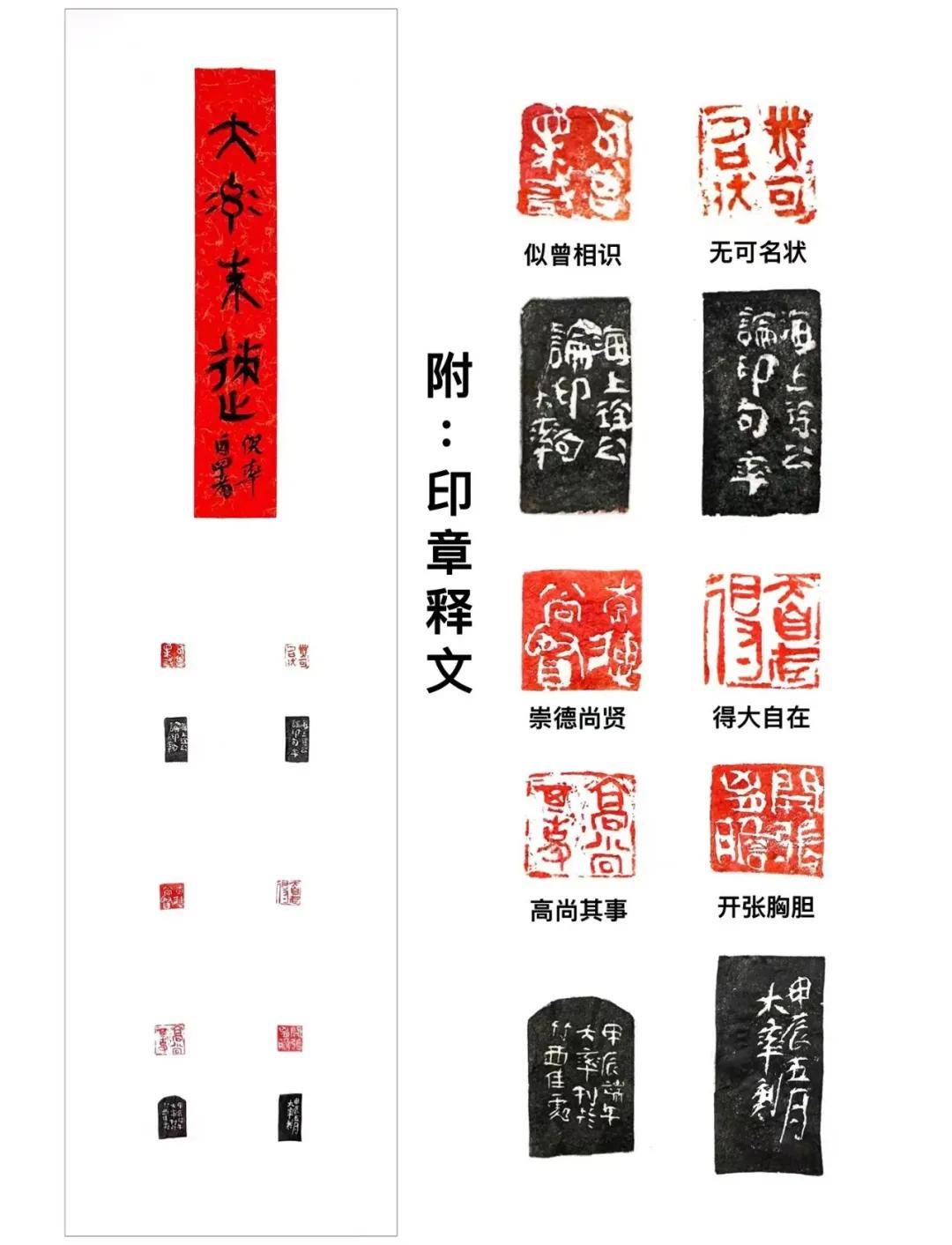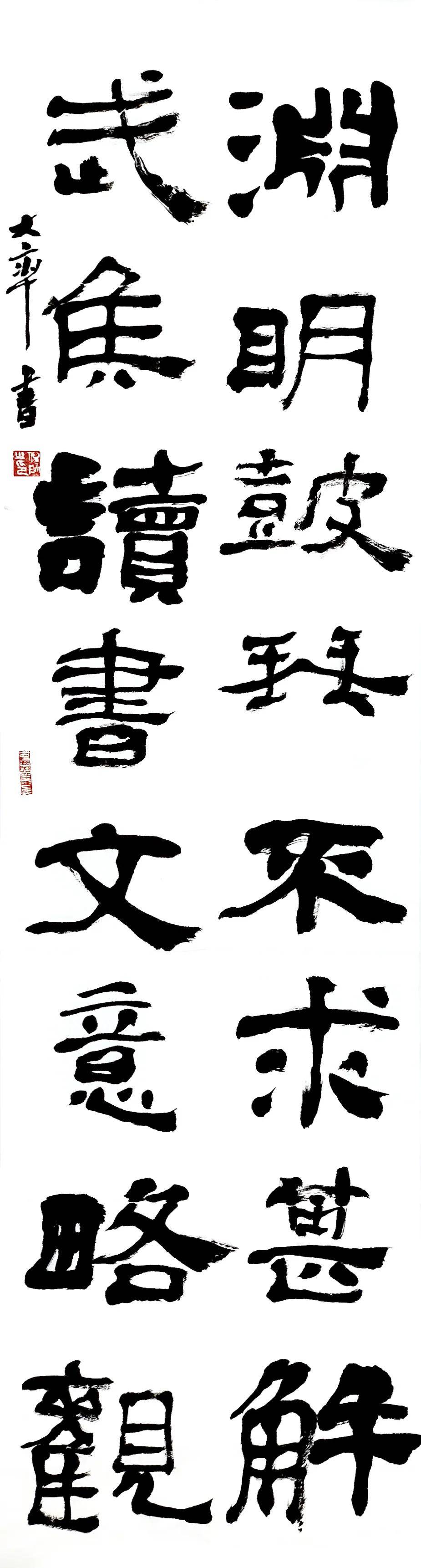 大率真大率,事不拘于谨细、笔不囿于工严,大率行去,但放精神、得意趣、见性情耳!其快意沉著处难测其年岁、莫辩其学养!黄口稚子、时见老笔,其非积于年、成于学,乃得于法、源乎禀也!率幼承庭训,父宽母严,宽则宽而端谨守则、严则严而自然无羁,守则者至极反悟自然法、无羁者无虑却多讲规矩,其相反相成处正是潜移默化浸润濡染之功也!率哉、率哉,其受教端坐而未失乎天性、任情嬉闹而不离于矩度,其调皮好动、自立自主幼异他童,其早获熏陶、得笔得趣迥乎他众。前人所谓不学而能、无师自通者于兹或得正解,不学者非不学也,是学而不知也;无师者非无师也,是师而不觉也!且日日浸淫于斯、刻刻陶育其间,坐卧行走、渴饮饥食,动止啼呼、喜笑怒骂,时时处处俱得其滋养而未尝一刻稍有违离也!不知其窍者视之恰似得之自然而秉乎天性,其实染于家室、积以时日也!率之习书作画咏诗治印不蹈常途,不袭于形、不循于矩,非于皮相处着力,乃舍貌而取神、忘形而求法,直抵本根者也。回视来路,其髫年执笔初以天性发之,稚子拙笔似无所师,实天真烂漫堪为长者师也;渐能发蒙,不免外感于同学师长,恐染于时,十龄后乃给以碑版造像,使味其笔、依其势,其虽未必解,拟亦不必肖,但使潜滋默养得其气息而感其格调也!长则继以晋唐法帖,习法矩、体精严,不求十分肖似,但能味其神韵气格则足矣!所谓借取他山之石以攻玉,权藉先哲妙墨以宣心也。其幼年习书既筑用笔挥运之基,且复陶染于经籍诗赋、水墨丹青,冶其才藻、骋其情性,童稚所习人谓如漆,岂为雕章琢句、安期工巧妍丽,乃在怡情冶性、适性骋怀,人与俱化浃入神髓,夺之不能去也。其既得尽适其天性而未加摧折,乃反要归乎绳墨、依于矩度,以天性入规矩,以规矩注天性,相反相成,既免害于矩范而失趣、又免染乎时习而入俗,天人相冶乃始稍有得也。率偶有所作,无不发乎禀赋、纯任天性,依于法而不囿于法、有所本而不困于本,即稍假于他人粉本亦必脱略乎形迹,笔姿所发,直见自家庭庑矣!其何为若此哉,乃在其虽不必朝朝耽读临池、日日图写切刻,而心神所萦、生活所系者未尝须臾离于画印诗书、明圣贤哲艺文国粹之陶育也。其得之自然、出之松活者概未加外力营求,不惑于外欲、未入乎外道故也!心迹外化之妙,无非见情见性,观之者或粲然或莞尔,其快意情洽处,一笑会心可也!自有乾坤从大率,岂拘形迹任天倪!