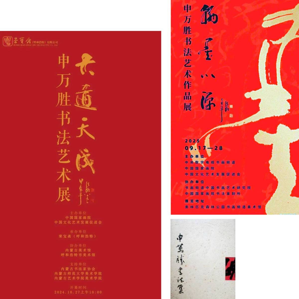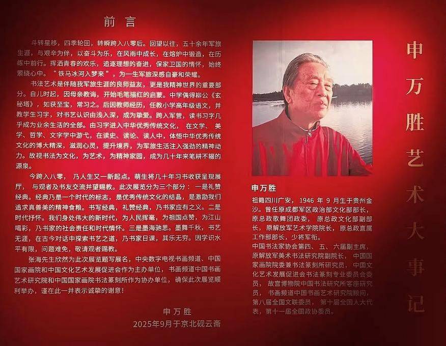 近两年,在呼和浩特举办《大道天成—申万胜书法艺术展》,展出其创作的七十余幅力作,作品兼具深厚传统功力与鲜明时代气息,体现了其“入古深”而“出古远”的艺术追求。在北京举办《翰墨心源—申万胜书法艺术作品展》展出百余幅精品,以“礼赞经典”“军旅情怀”“时代新韵”三大板块呈现,在耄耋之年回望五十余载军旅生涯,全面展示了其从传统经典中汲取营养、抒发军人壮志、歌颂时代风貌的书法艺术历程。