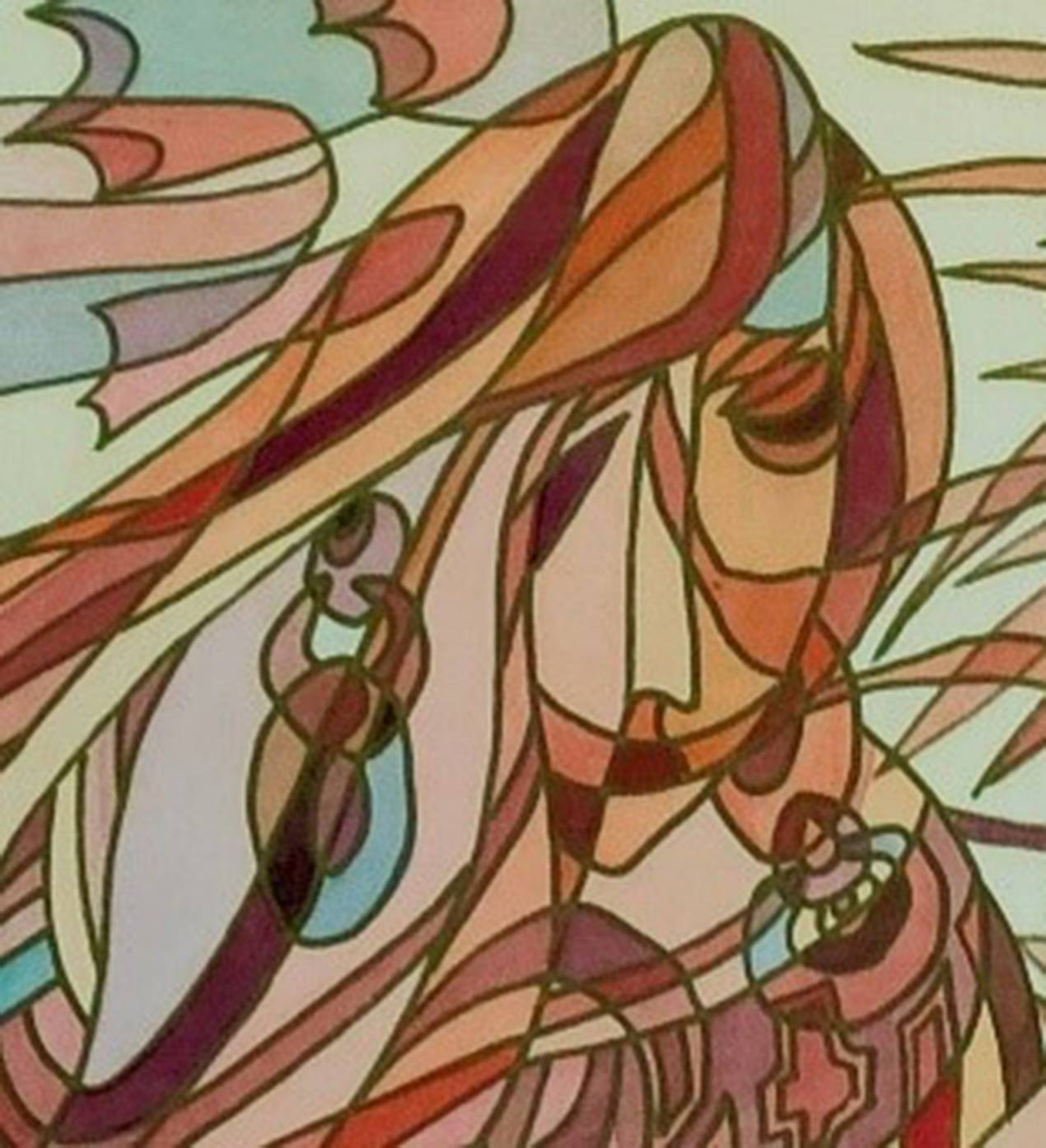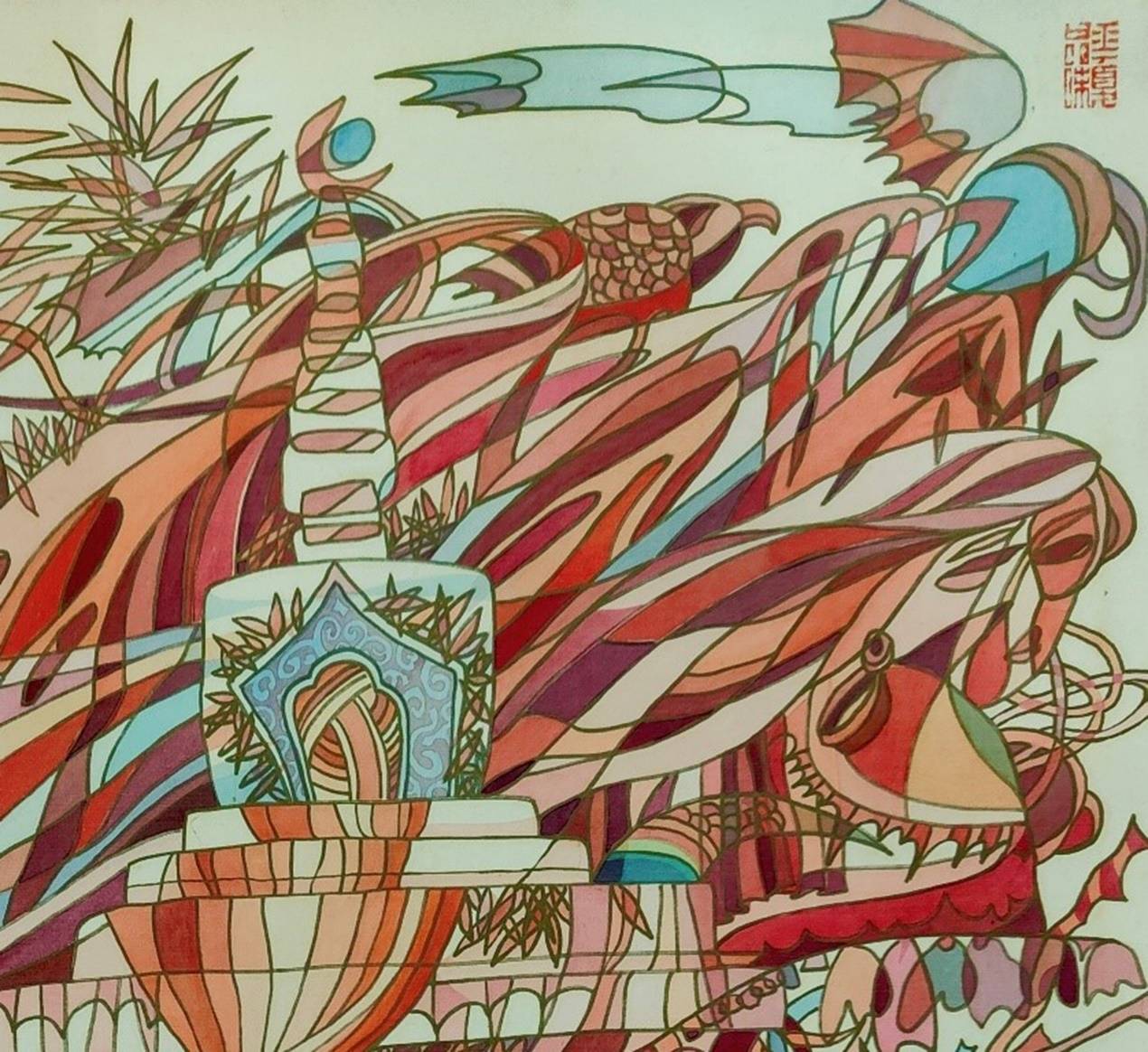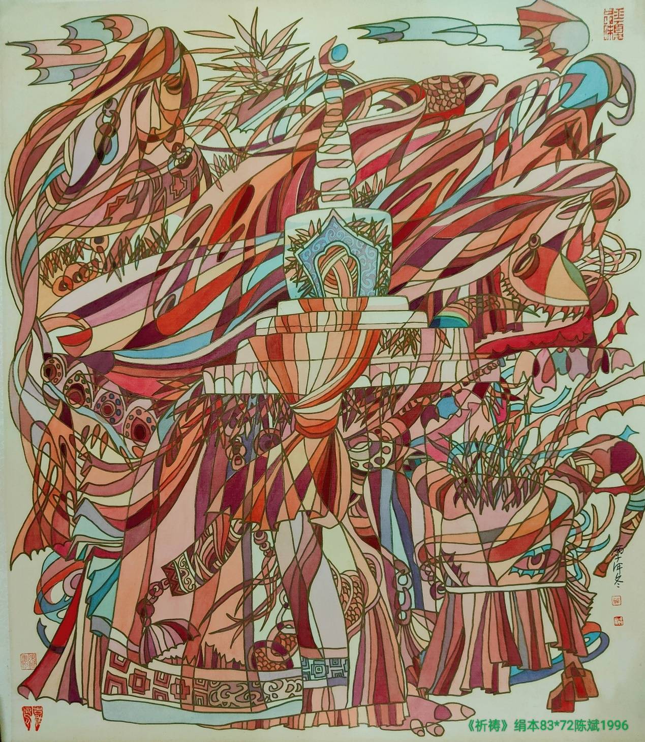 最终,陈斌的目光超越了局部变形,投向了那个必将诞生的终极造物——一个自洽的、可栖居的“意义流形”。在这个新世界里(如《吉祥藏女》),宗教的虔敬与自然的生机不再并置,而是被彻底重铸、融合,升维为一个全新的超级符号(如弥漫的“吉祥光晕”)。这个流形,既与初始的两个位形保持永恒距离(实现了什克洛夫斯基所追求的极致陌生化与感知延长),又因其严格遵循几何诗律而呈现出内在的和谐与秩序(体现了康定斯基所推崇的精神与形式的理性统一)。