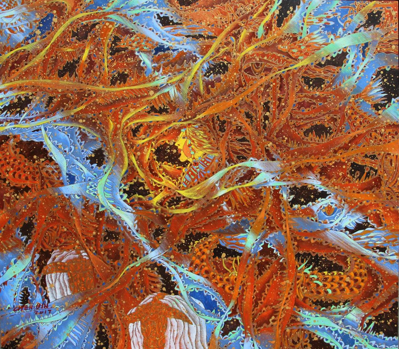 什克洛夫斯基认为,“陌生化的本质,是对常规认知的反叛,是创造全新感知体验的冲动”。陈斌拒绝简单重复宗教工笔或自然工笔的既定范式,而是主动将两个异质意象进行拓扑融合,正是这种陌生化冲动的体现;而康定斯基则强调,“艺术的浪漫表达,并非无拘无束的肆意发挥,而是在理性法则约束下的精神释放”。陈斌的创作冲动,始终围绕“最大化有效陌生度”的理性目标,从未脱离几何诗律的约束,这正是浪漫与理性的共生。