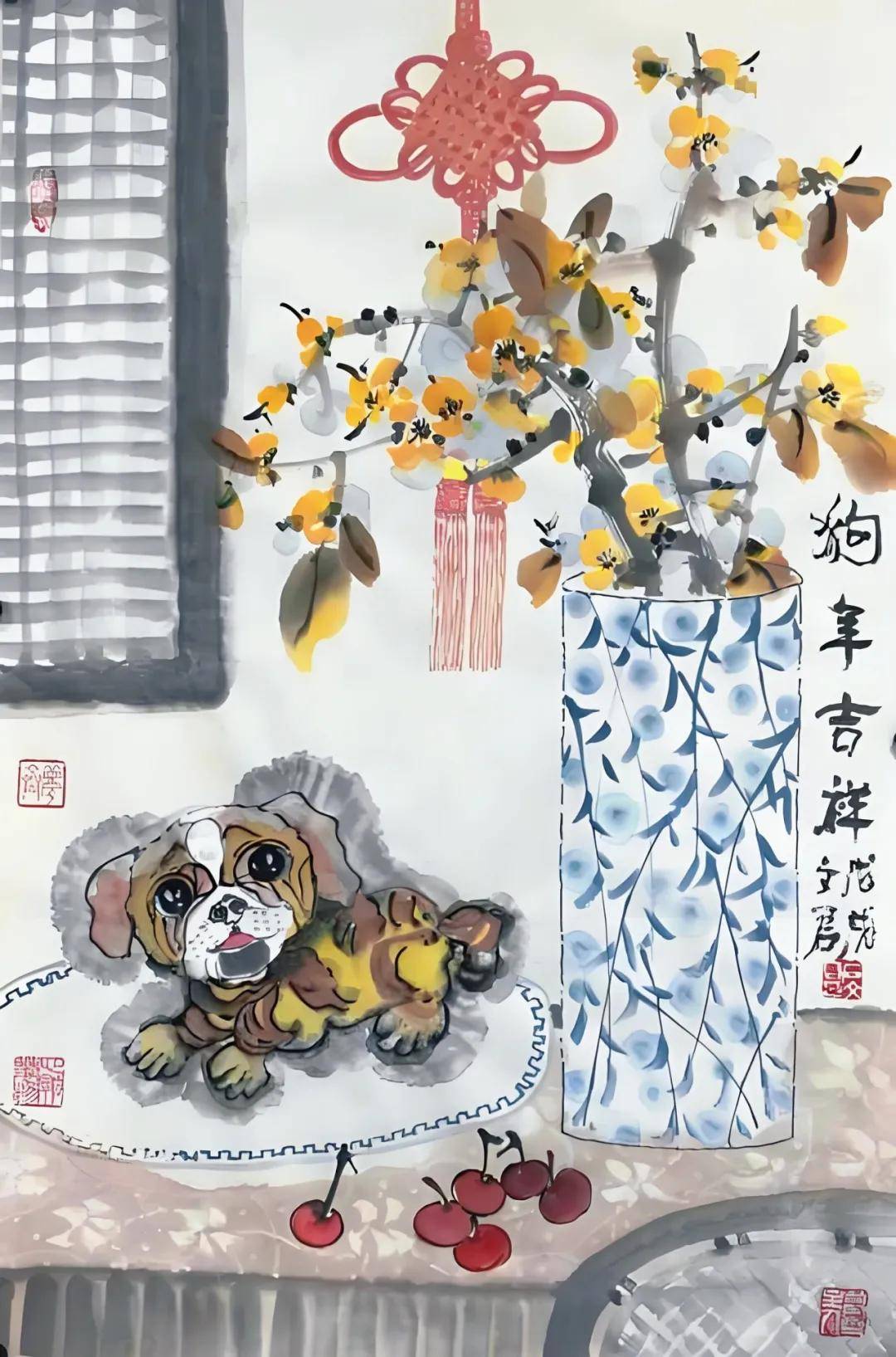 细细品读石文君老师的花鸟画作品,我们能够感受到铺面而来的生活气息。画作题材雅致,贴近生活,主题多围绕传统文人清供与日常生活雅趣展开,如瓶花(梅、兰、百合、向日葵)、茶具、文房、蝴蝶、小鸟等。这些题材蕴含着平安、吉祥、高洁、向阳等美好寓意(如“狗年吉祥”、“朝阳”等等),这些画作也体现了作者对传统文化的继承和对美好生活的深刻体会。这些花鸟画作品构图精巧,富有形式感,善于运用多种画幅形式(如常规立轴、扇形、圆形),增加作品的多样性和装饰性。
