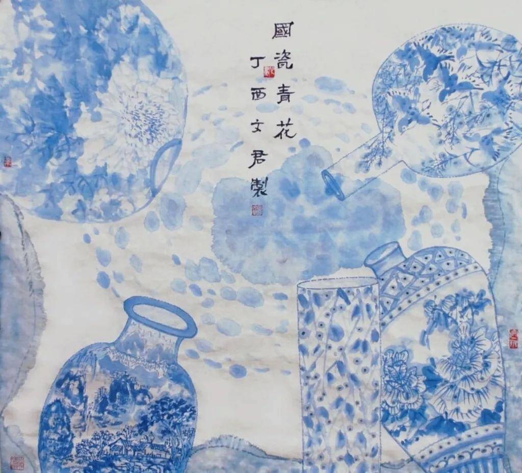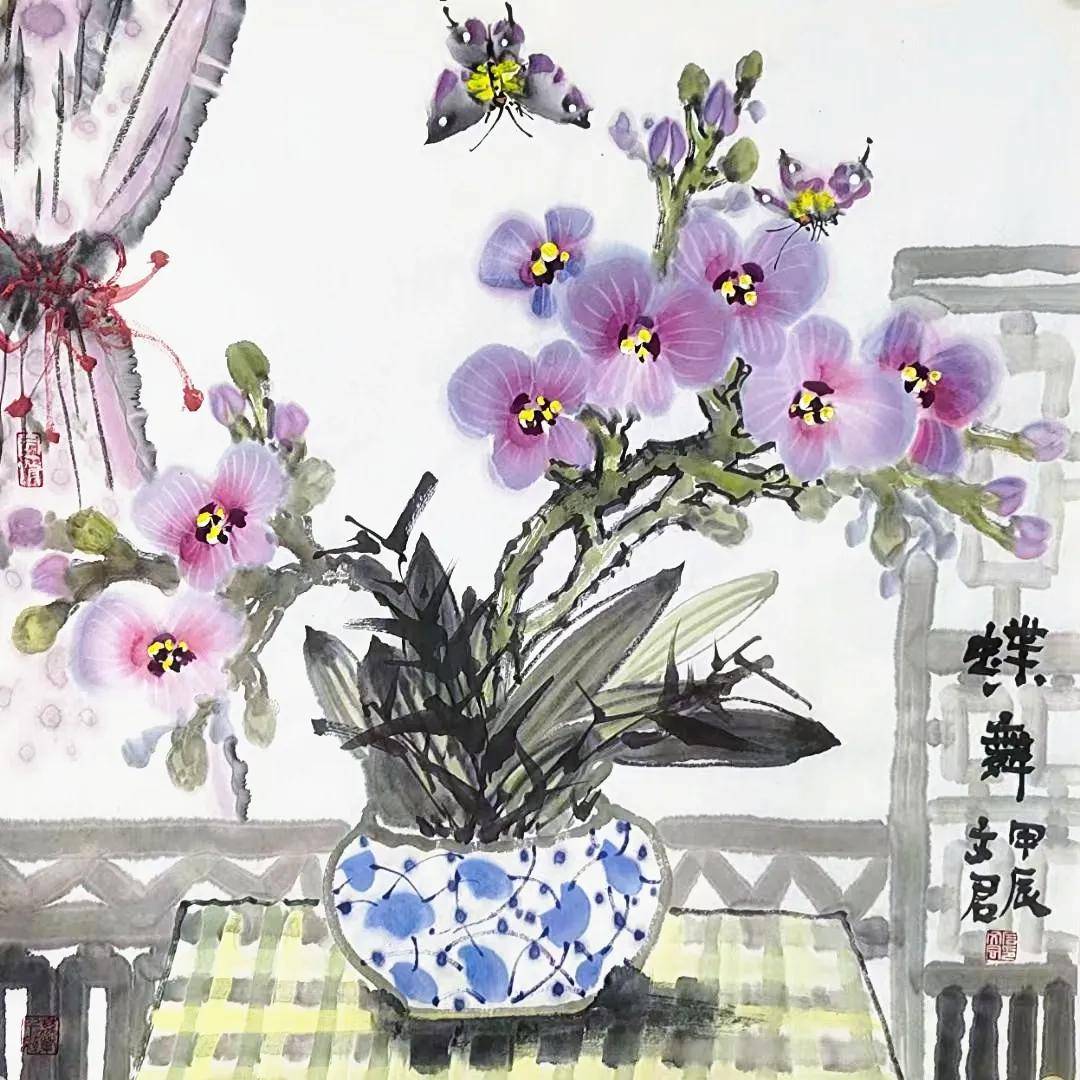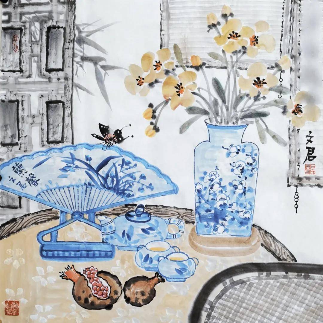 石文君老师的花鸟画作时常运用背景色(浅蓝、浅绿、灰)来衬托主体,营造统一、和谐的画面基调。笔墨细腻,兼具工写,花卉、蝴蝶、小鸟的描绘细致生动,而枝干、山石、背景则用笔更趋写意、简练。线条运用肯定,物体造型准确又不失灵动。富有文人意趣与书卷气的画面中经常融合书法题款与红色钤印,且印章位置讲究,与画面构图融为一体,增强了作品的传统文人画气息。作品“庭院吹香”、“朝阳”等青花系列画作意境优美,直接点明或烘托了画作的诗意氛围。
