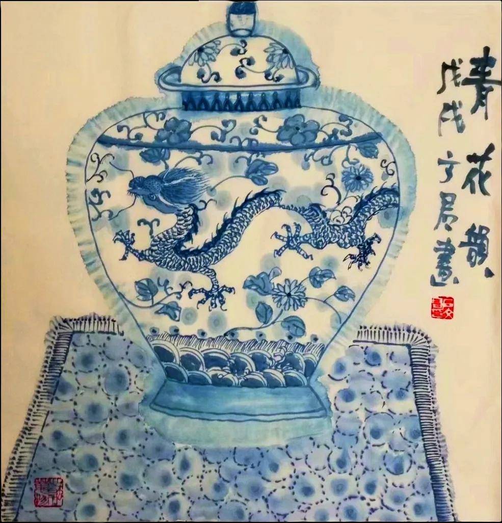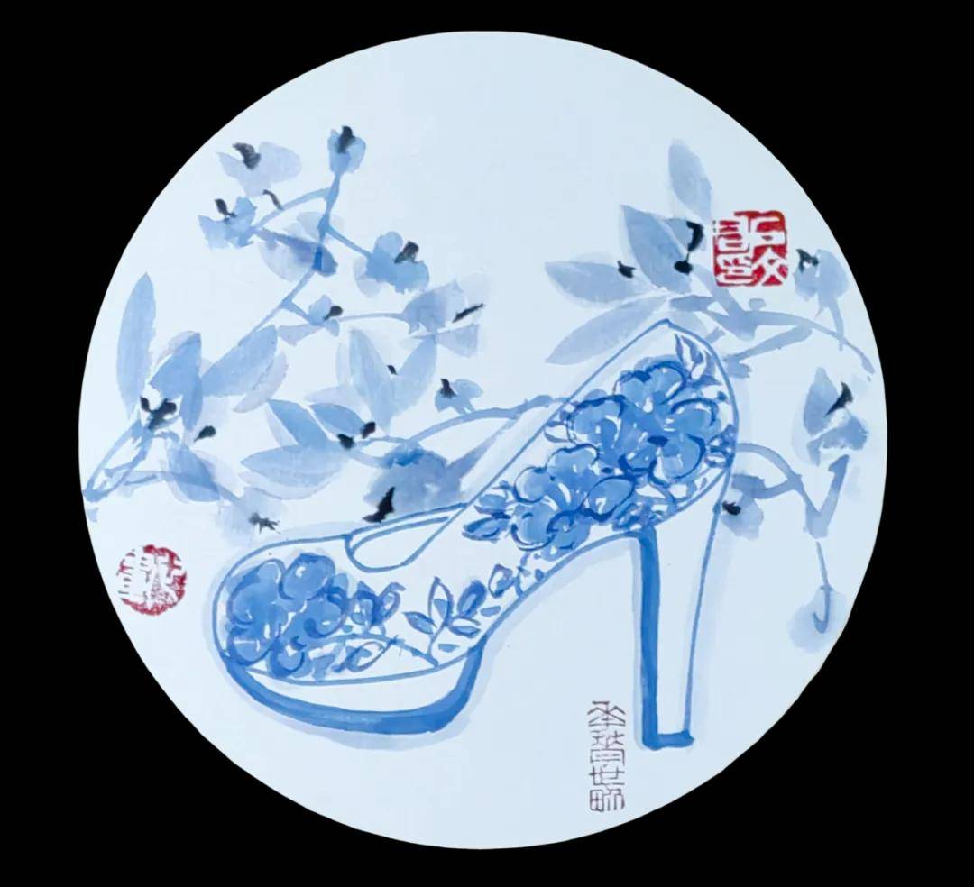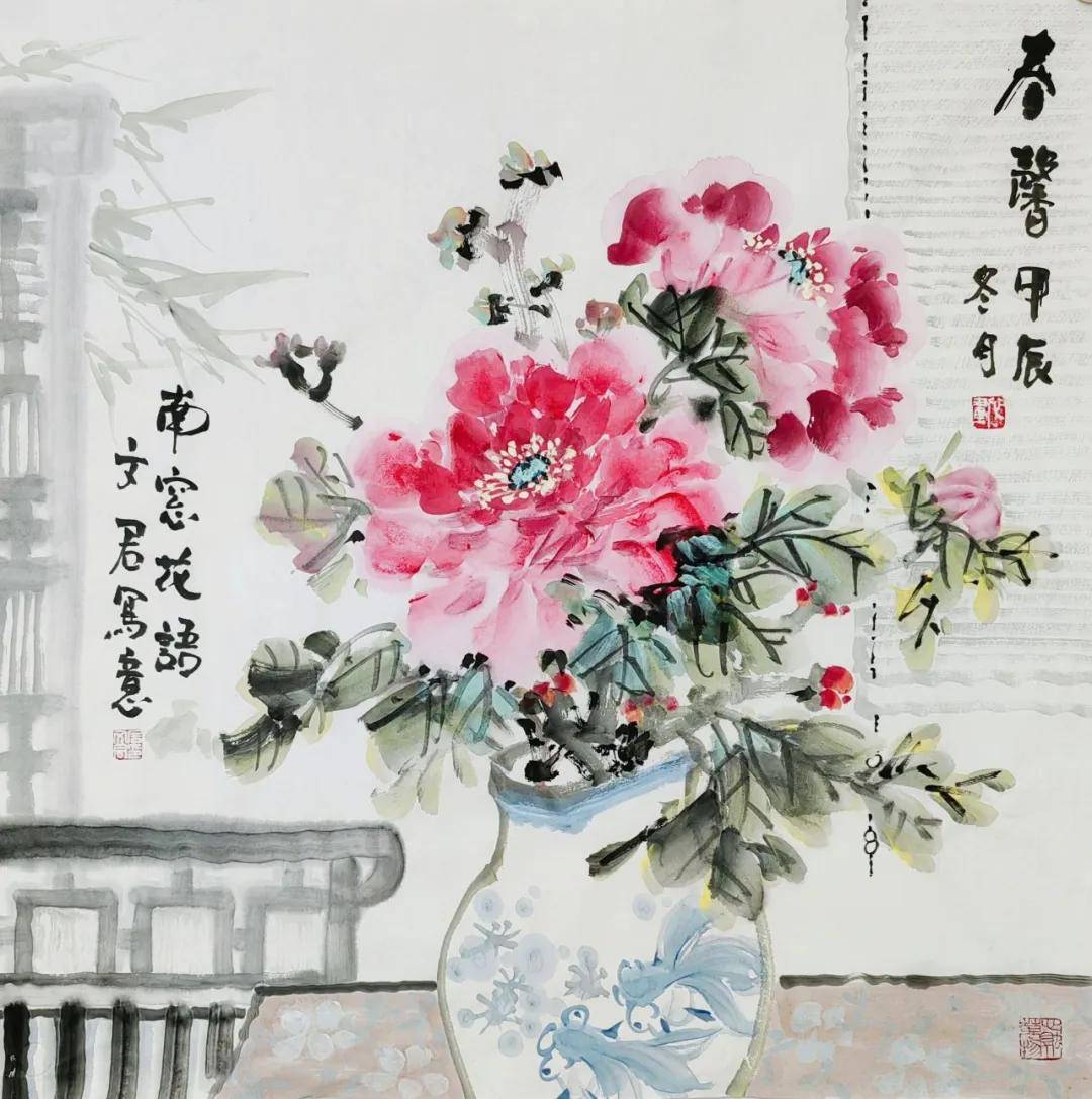 石文君老师的花鸟画作时常运用背景色(浅蓝、浅绿、灰)来衬托主体,营造统一、和谐的画面基调。笔墨细腻,兼具工写,花卉、蝴蝶、小鸟的描绘细致生动,而枝干、山石、背景则用笔更趋写意、简练。线条运用肯定,物体造型准确又不失灵动。富有文人意趣与书卷气的画面中经常融合书法题款与红色钤印,且印章位置讲究,与画面构图融为一体,增强了作品的传统文人画气息。作品“庭院吹香”、“朝阳”等青花系列画作意境优美,直接点明或烘托了画作的诗意氛围。