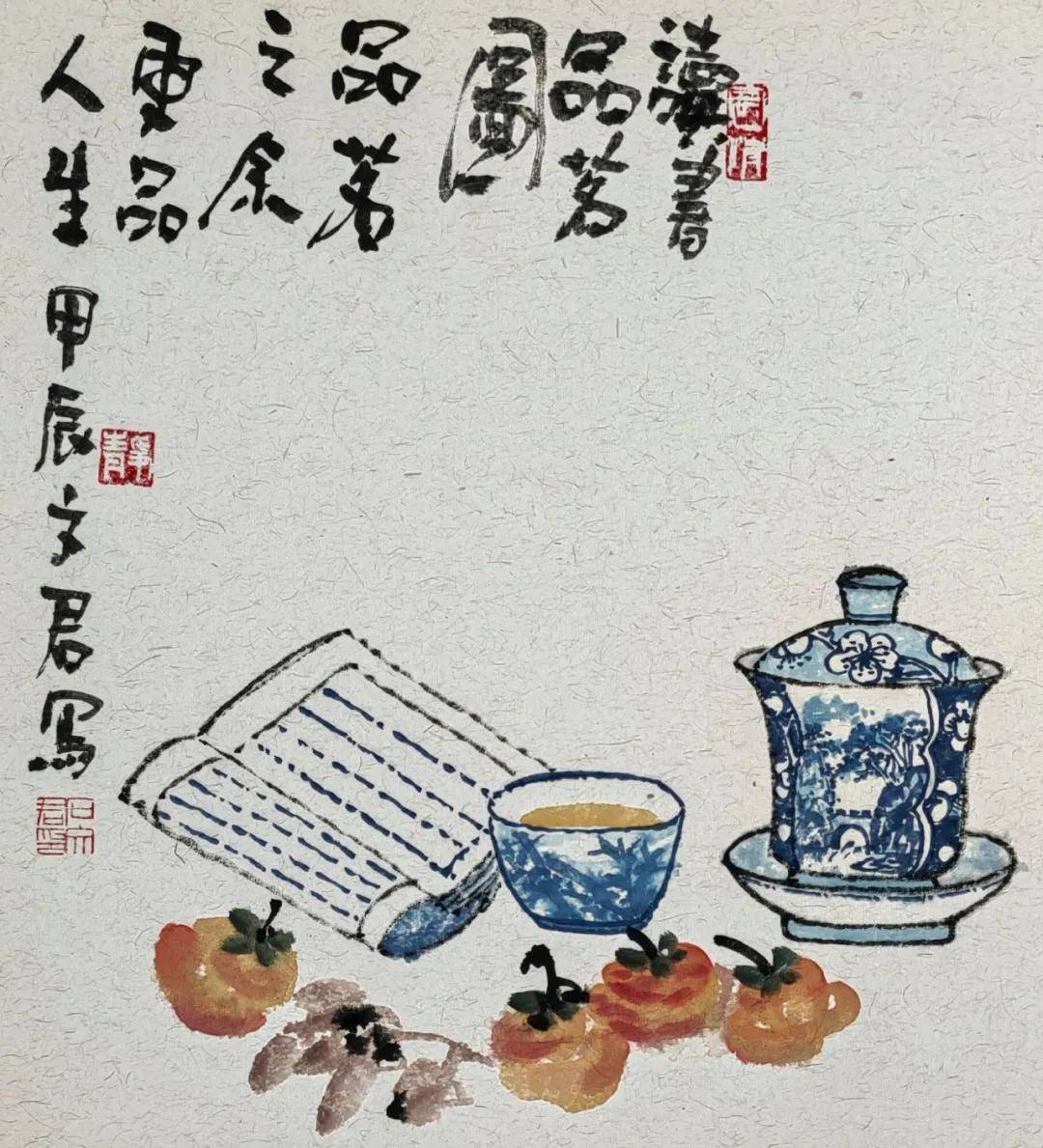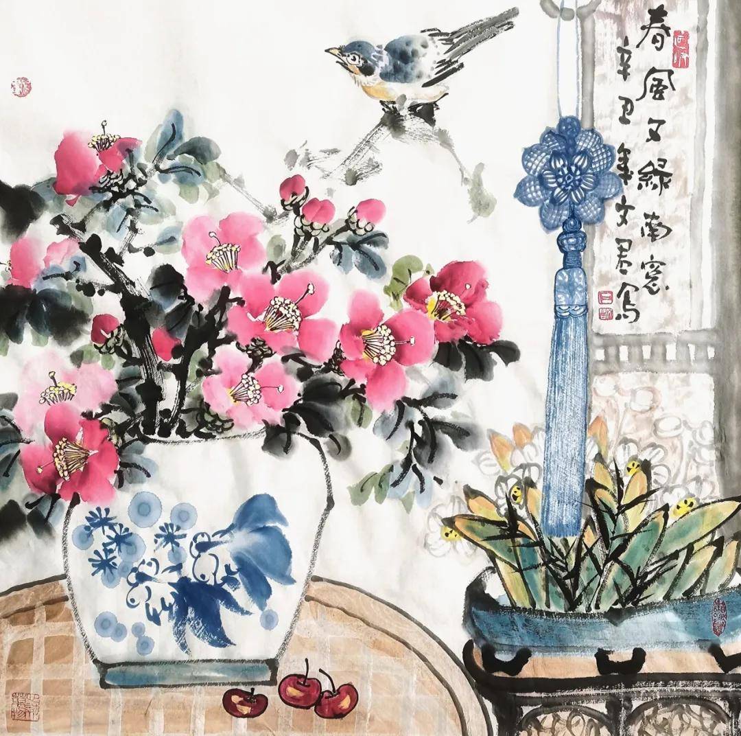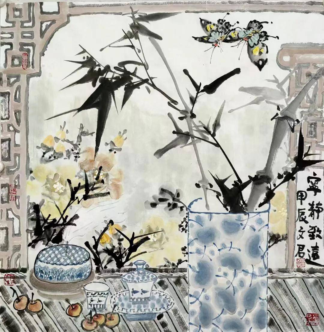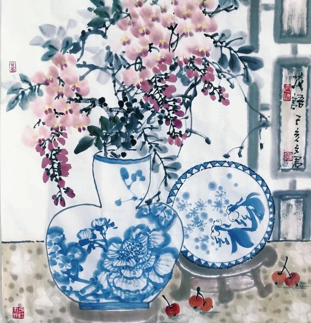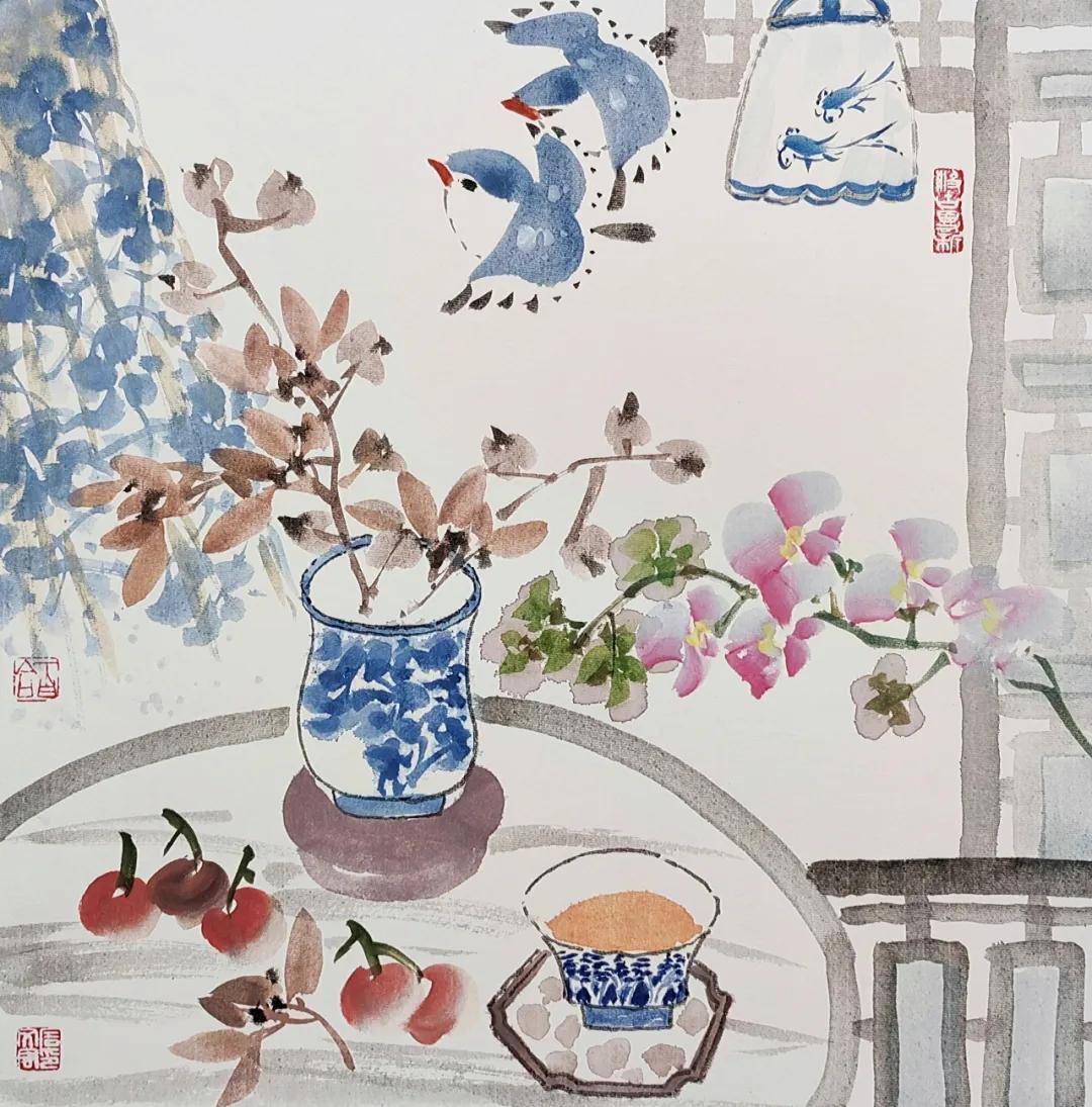 石文君老师内心宁静,热爱生活,画作整体氛围清幽、静谧、雅致,毫无浮躁之气。这反映出画家内心世界的平静与丰盈,善于从平凡的瓶花、茶事中发现美、营造美,对日常生活充满热爱与珍视。作品在主题、构图、用色、题款均体现出深厚的中国传统文化修养和文人审美情趣。画家显然深受古典美学熏陶,追求的不是炫技,而是含蓄、典雅、充满书卷气的意境表达。石文君老师观察入微,心思细腻,对花卉形态、器物纹样、昆虫动态的描绘都相当细致到位,画面中诸多精巧的细节安排(如散落的樱桃、飞舞的蝴蝶),也体现了其细腻、精巧的构思。
