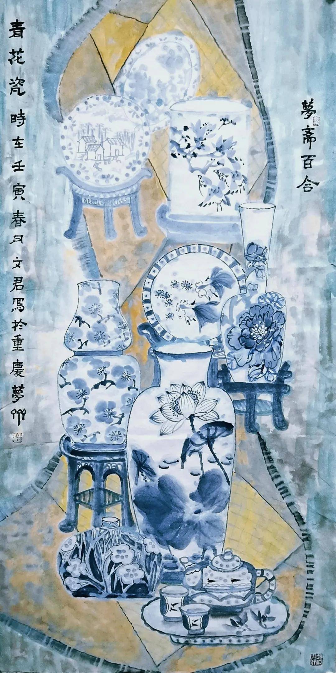 构图注重空间层次与平衡,常以花瓶、茶具、山石作为画面主体,背景巧妙搭配窗棂、竹帘、栏杆、屋檐等元素,形成“画中画”、“景中景”的效果,营造出深邃、雅致的庭院书斋氛围。画面疏密有致,物品摆放看似随意,实则经过精心安排,充满节奏感。色彩清新,色调和谐,整体色彩倾向淡雅、清丽。瓶花的粉、白、黄、紫,搭配青花瓷的蓝白、木质的褐、窗棂的灰黑。色彩对比柔和,不显艳俗。即使有鲜艳之色(如红色中国结、樱桃),也多作为点睛之笔,不破坏整体的宁静感。