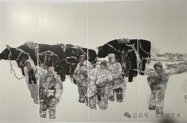 这一笔墨高度,在《抗联组画——生存》中达到巅峰。作品以写意笔墨营造悲壮氛围,以写实造型刻画人物精神,将特定历史中的民族气节与抗争意志表现得淋漓尽致,荣获第十届全国美展金奖。《九八纪事》获第九届全国美展银奖,以沉凝笔墨写灾难中的人情温暖,承载着对生命的尊重与时代的关怀。他既能放笔写天地气势,也能细笔刻神情风骨,于眉眼、衣纹、手足之处见精微,“沉雄”与“精微”兼备,为当代人物画树立了极具深度的范式。
