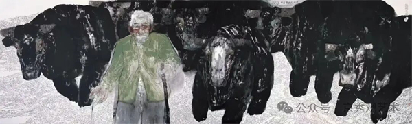 在东北题材作品中,他不把人物符号化,而是还原其生命本色。《大雪》《老人与牛》《黄昏,老头让牛群跑起来》等作品,笔墨粗粝而深沉,格调苍茫而内敛,写出土地的厚重与人的力量。近年《毒日头》《春寒水冷》《春天将至》等新作,依旧沿着这条路径,以更具张力的构图与质感,把黑土地的生存状态写得真切动人。他不刻意美化,不虚情抒情,只以朴素而诚挚的笔意,为平凡生命立像。