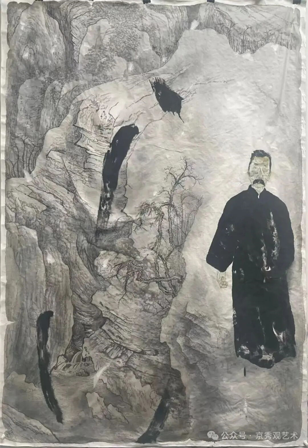 其艺术中最具个人面貌的,是他长期摸索而成的沉墨积染之法。并非简单堆砌墨色,而是先以湿纸打底,待纸性略稳再施浓墨,使墨色层层渗透、沉厚交融,黑而亮、厚而透,沉劲有力却不板滞。这种独有的笔墨质感,与他的艺术追求高度一致,辨识度极高,亦不泥古守旧,不困于旧时程式。同时,他合理借鉴西方的造型与光影结构,融入东方笔墨意趣,在《九八纪事》《夜草》等作品中实现了自然的融合,使笔墨既有传统文人气韵,又具备现实主义表现力。