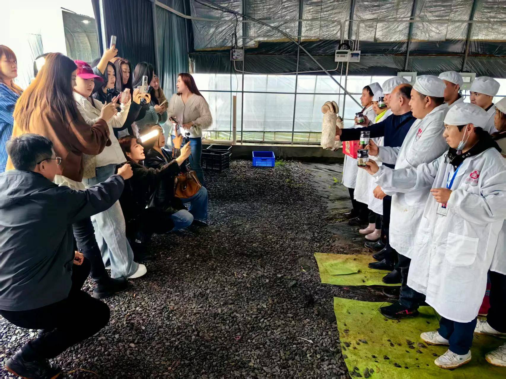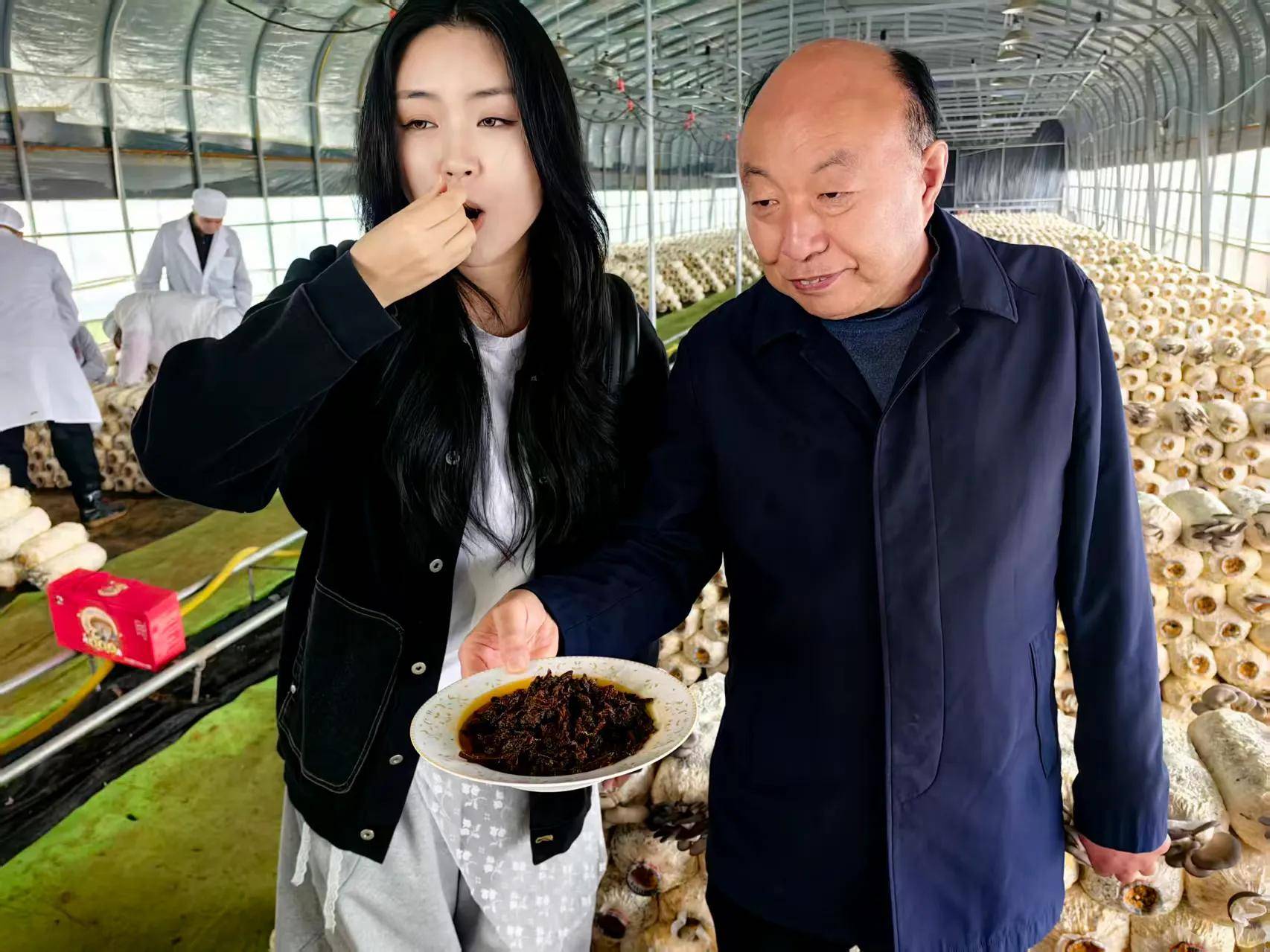 网红们深入大棚、田间、工厂和丁伦保交流蘑菇发展,了解蘑菇在乡村振兴,农民增收中发挥的作用,产品对人体的好处,丁伦保认真地给予解答。