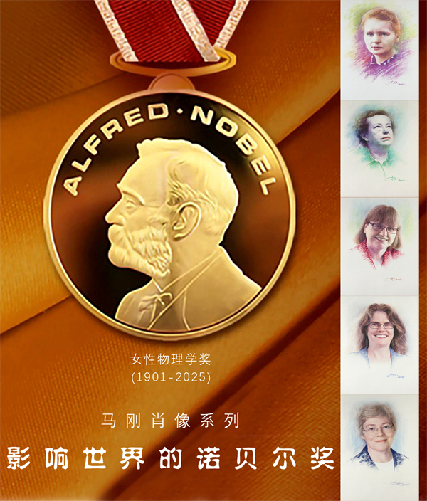 在国际妇女节3.8这个特别的节日里,艺术家马刚跟您分享女性科学家系列诺贝尔物理奖的历年获奖者(1901年--2025年)。自1901年诺贝尔奖设立以来,至今全球仅有5位女性科学家获得。马刚以肖像画形式图文并茂向您介绍,她们分别是1903年的玛丽·居里(法国),1963年的玛丽亚·格佩特-梅耶(美国),2018年的唐娜·斯特里克兰(加拿大),2020年的安德里亚·格兹(美国),2023年的安妮·吕利耶(法国)。