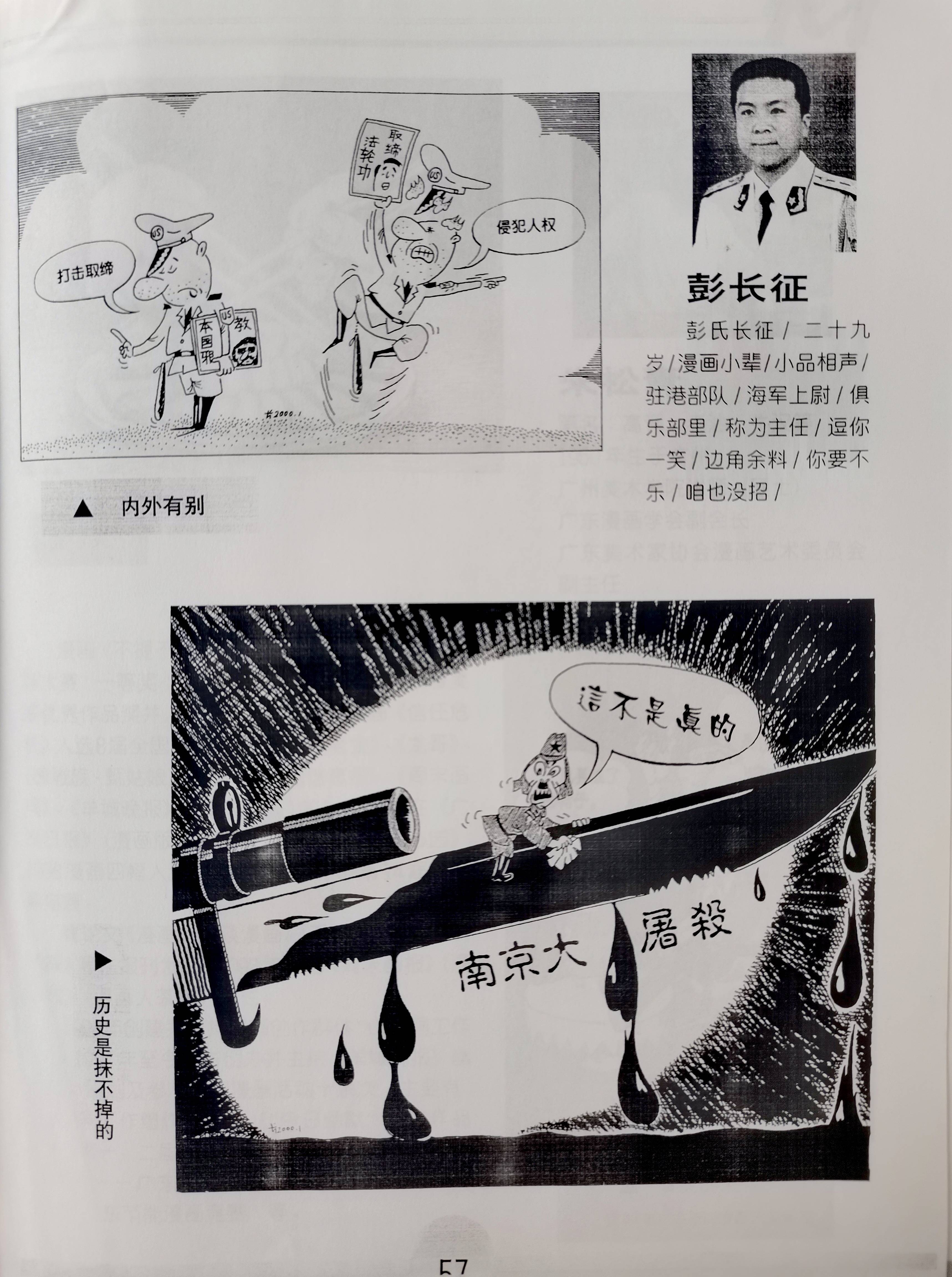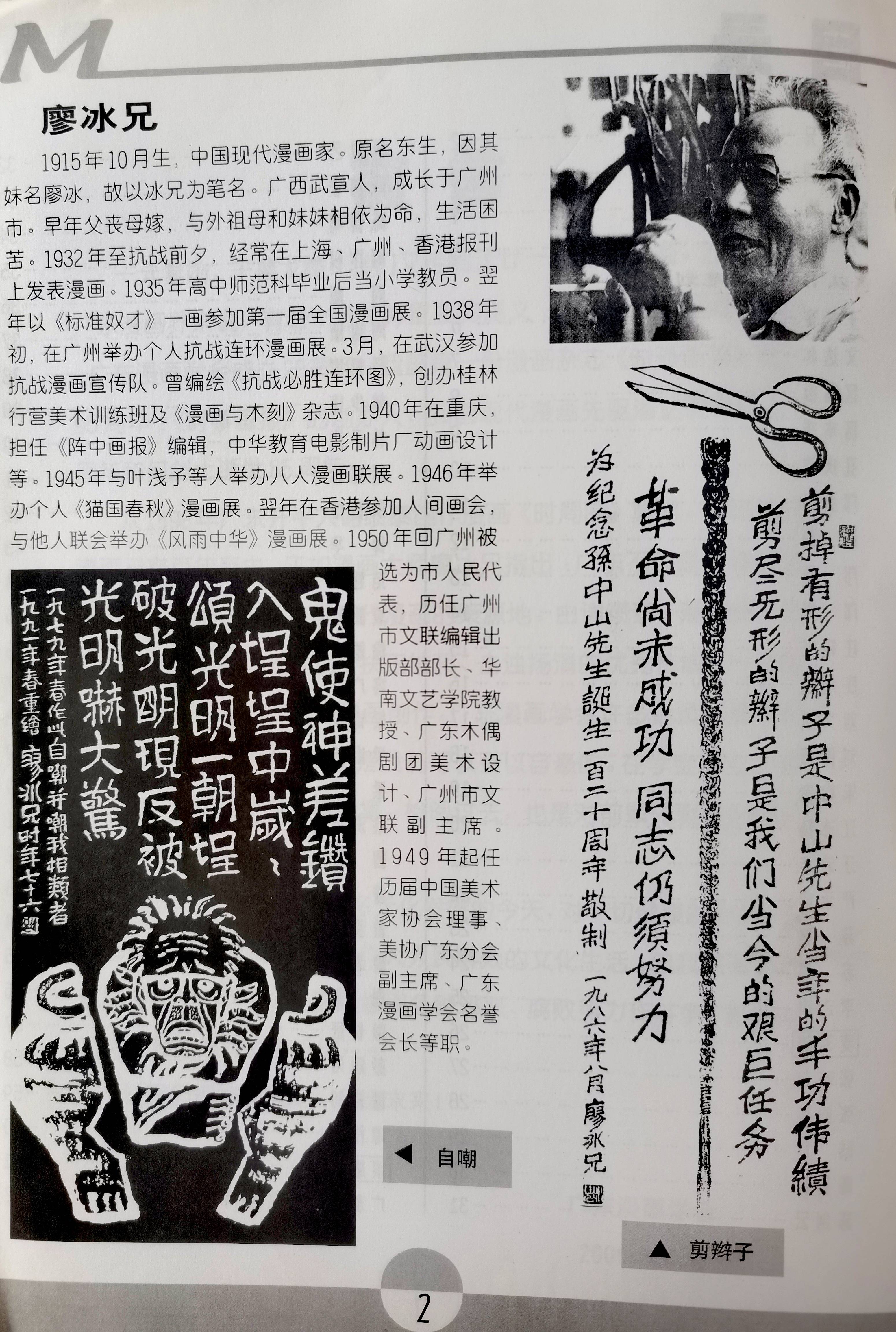 2000年时,为庆祝建会20周年,由廖冰兄题写书名的《广东漫画学会作品选》中收录《自嘲》和《剪辫子》。我当时由《深圳特区报》著名漫画家庄锡龙介绍,此前从驻香港部队加入该会,曾在《解放军报》发表的《历史是抹不掉的》和《内外有别》也收入其中,这本漫画集我收藏至今。